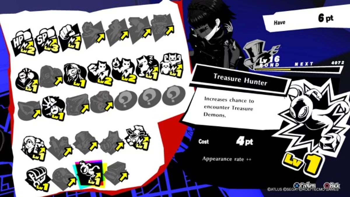 Навык шантажиста выполняет простую роль: благодаря ему вы получаете больше денег после каждого боя. «Охотник за сокровищами» повышает шанс встретить демонов сокровищ (Treasure Demons), враждебных существ, победа над которыми приносит много опыта, денег и предметов. Прокачка этих навыков также поможет повысить уровень персон.