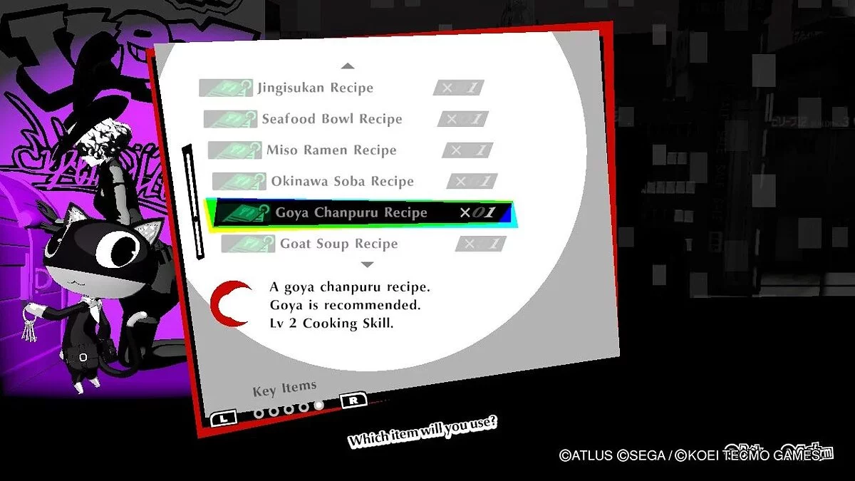 - Гойя Чанпуру (Goya Chanpuru) — 18 августа (August 18th) поговорите с Футабой (Futaba) на Окинаве (Okinawa) после прохождения тюрьмы (Jail). Ингредиенты: гойя (Goya), яйцо (Egg), свинина (Pork), тофу (Tofu). Эффект: восстанавливает 40 здоровья и добавляет эффект Масукукая (Masukukaja): повышение шанса критического удара и урона всем союзникам;