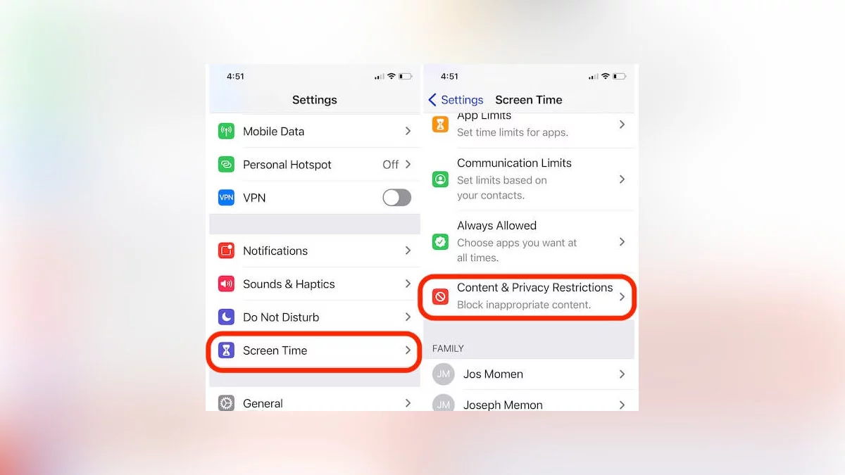 - Перейдите к пункту «Ограничения содержимого и конфиденциальности» (Content & Privacy Restrictions);