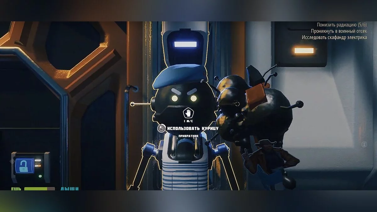 Попасть в военный отсек не так-то просто. Вход туда охраняет робот-привратник с настройками командира десантников. Порция юмора от общения с ним вам обеспечена. А чтобы пройти мимо, потребуется военный скафандр, который можно создать, используя следующие предметы: