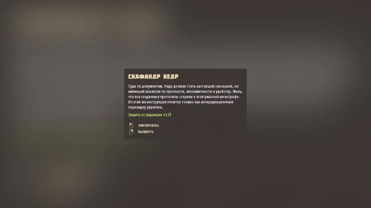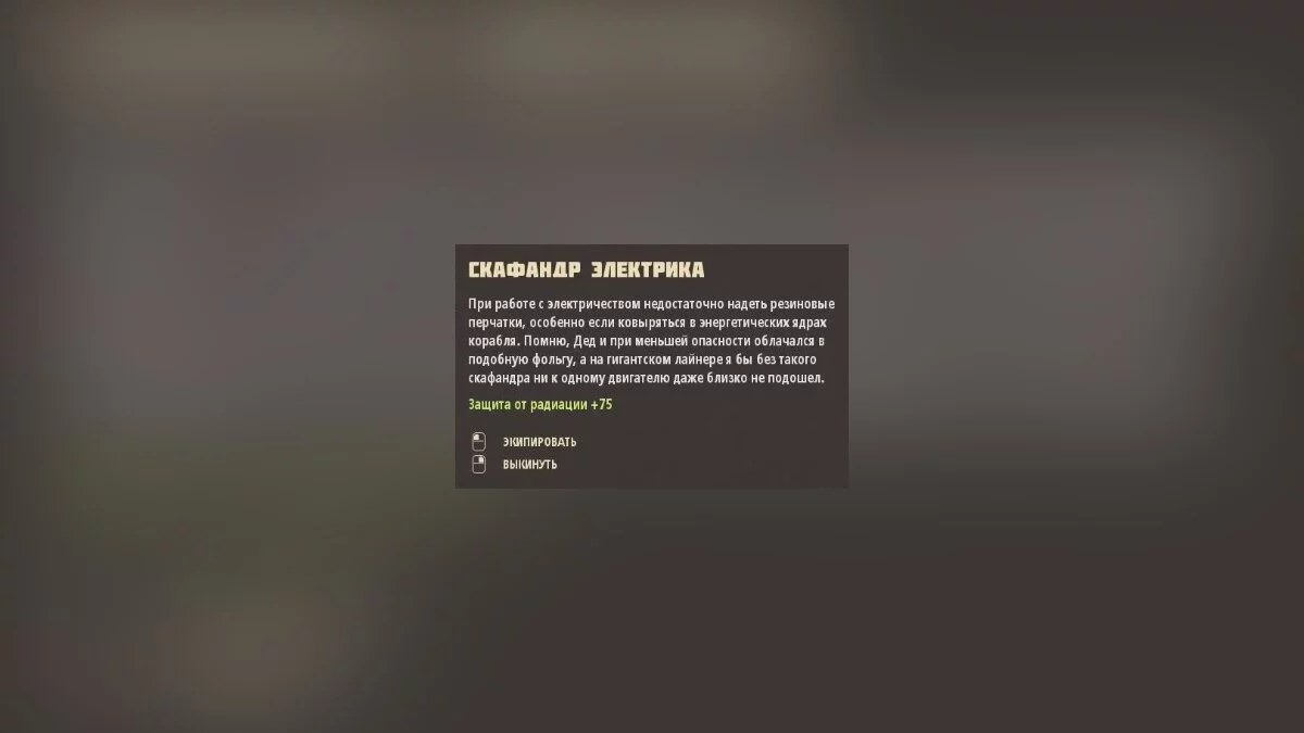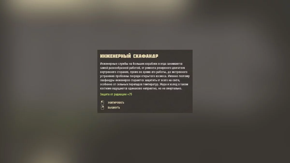 Возможность крафта данного скафандра отсутствует, но можно создать усиленную версию, показанную выше. Обычный траурный скафандр для похорон. Самый слабый скафандр в игре.