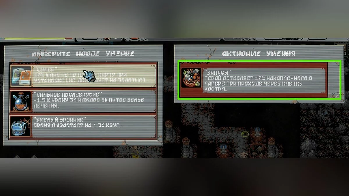 Если вы хотите безопасно сохранить часть ресурсов не завершая экспедицию, то вам нужно прокачать уровень своего персонажа минимум до шестого. Иногда на этом уровне вам будет доступно три различных умения, среди которых будет навык «Запасы». Это умение позволяет сохранить 10% от всех собранных ресурсов каждый новый круг, когда персонаж проходит клетку со своим лагерем. Такая способность отлично подойдёт для безопасного сохранения полученных ресурсов, так как после гибели, скорее всего, большая часть добычи уже будет находиться в вашем лагере.