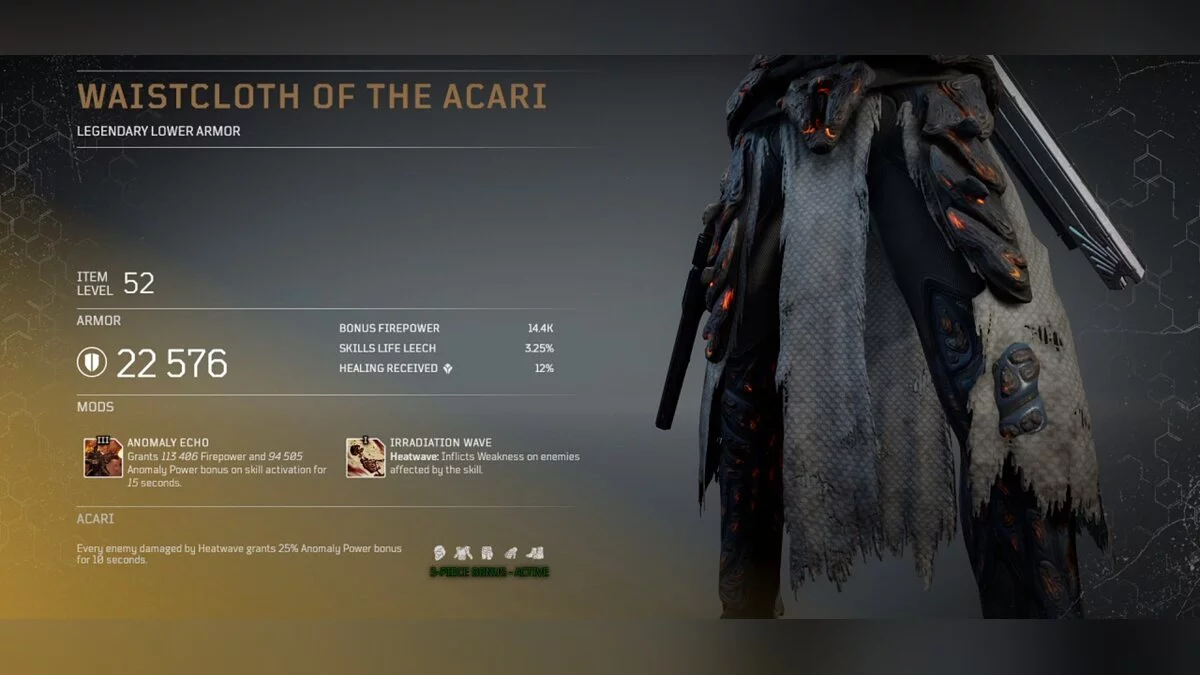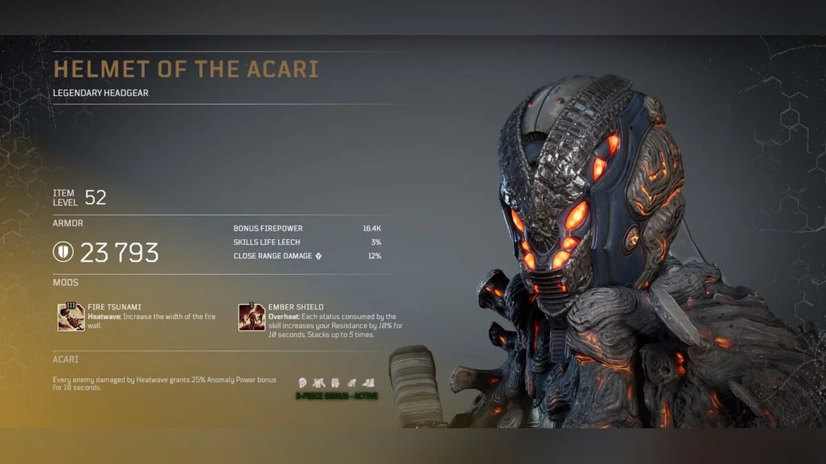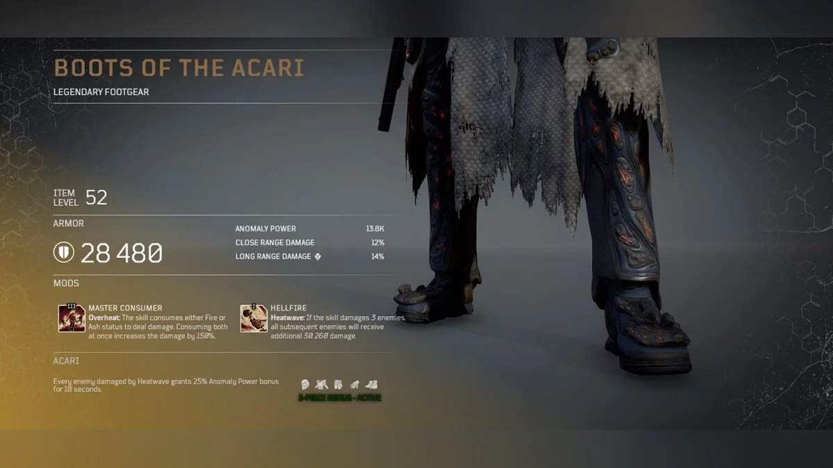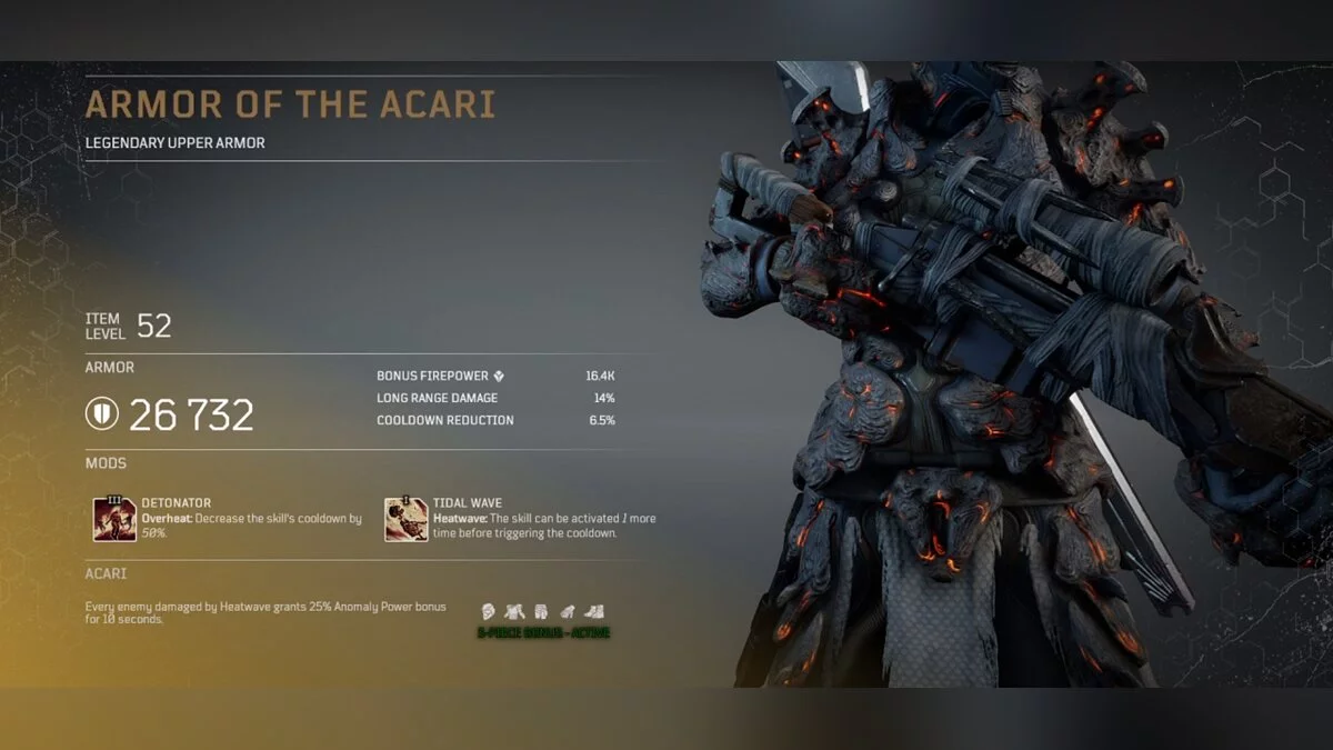 В качестве запасного варианта можно использовать комплект брони «Акари» (The Acari Armor Set), который усиливает навык «Тепловая волна» (Heatwave).