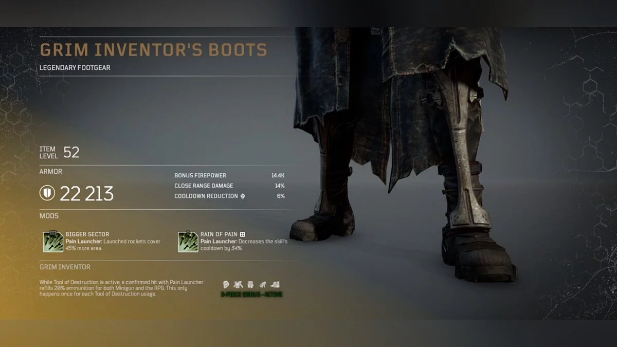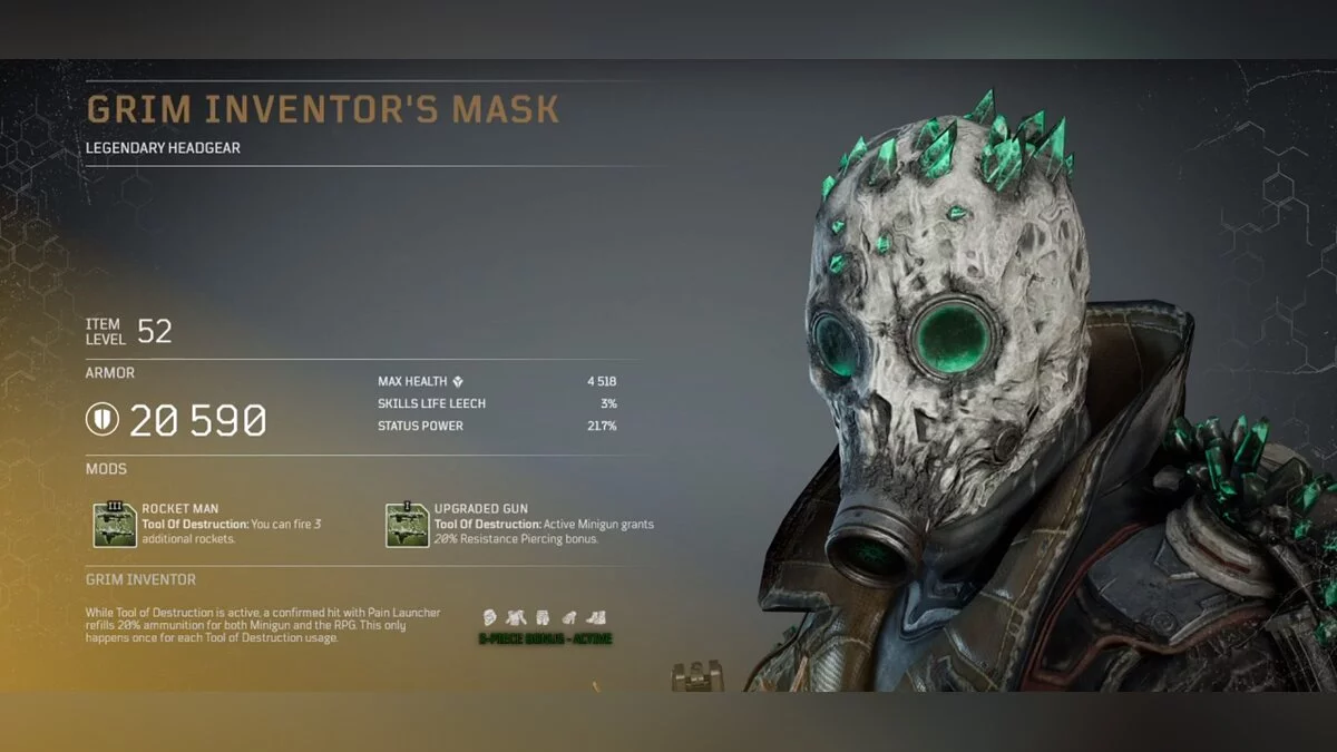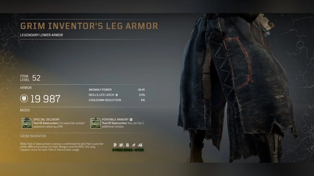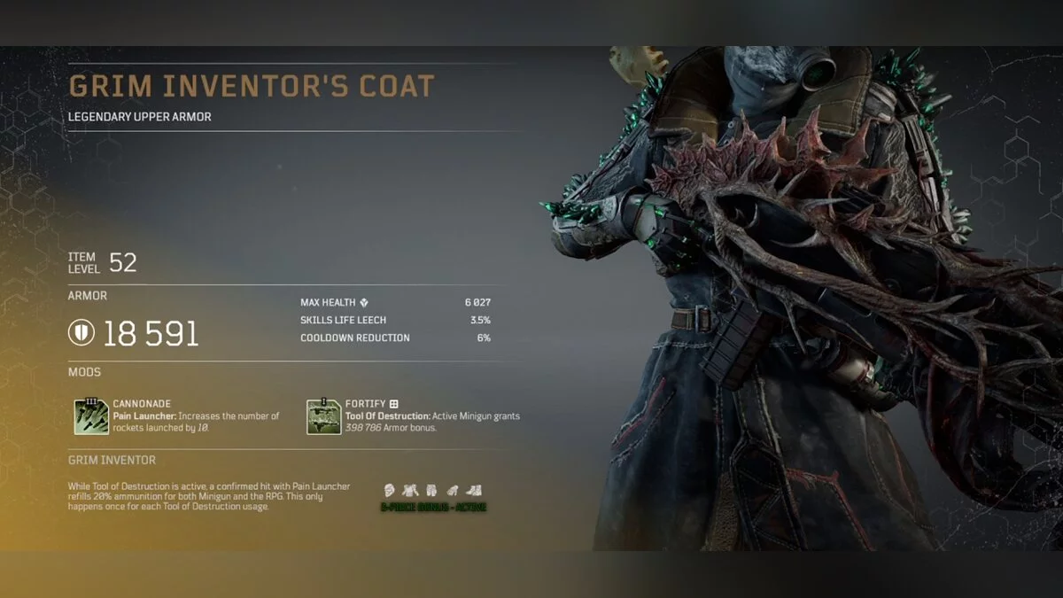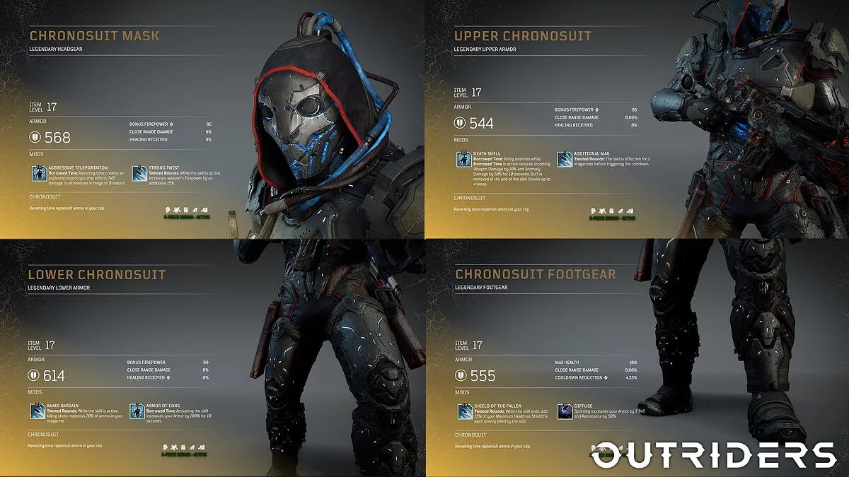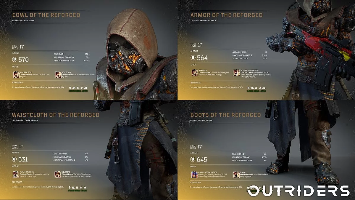 В Outriders существует несколько легендарных комплектов брони, которые доступные Техноманту, однако в первую очередь рекомендуется обратить внимание на набор «Мрачный изобретатель» (Grim Inventor Armor Set). Этот комплект брони усиливает навык «Реактивная боль» (Pain Launcher), который восстанавливает 20% боеприпасов при попадании в противника.