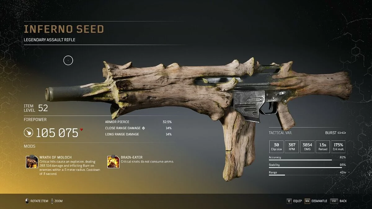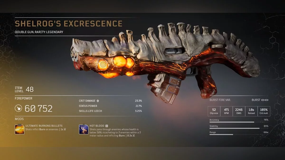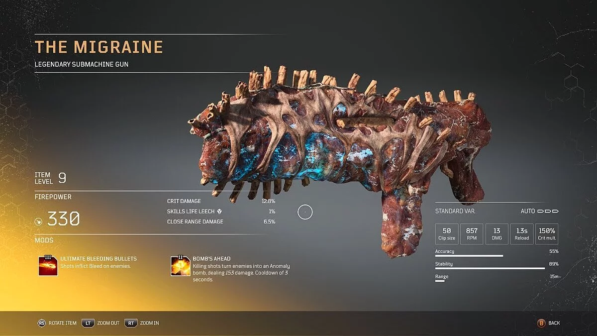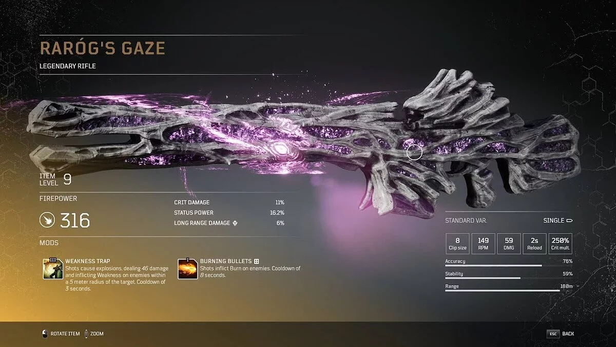 Если вам не терпится начать собирать легендарное оружие, то винтовка «Взгляд Рарога» (Raróg's Gaze) является отличным вариантом благодаря установленным модификациям, которые накладывают эффект ожога на противников и применяют специальные взрывающиеся снаряды. Также стоит рассмотреть пистолет-пулемёт «Мигрень» (The Migraine) в качестве второстепенного оружия, способного нанести серьёзные ранения противнику при помощи эффекта кровотечения.