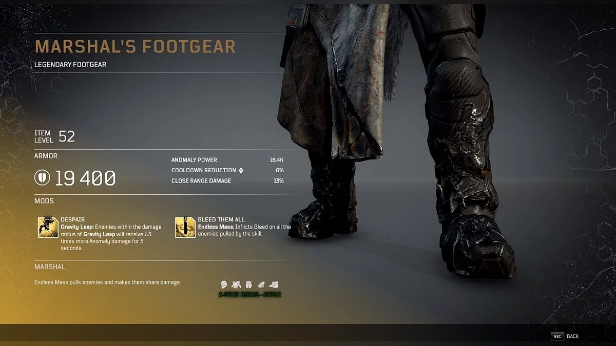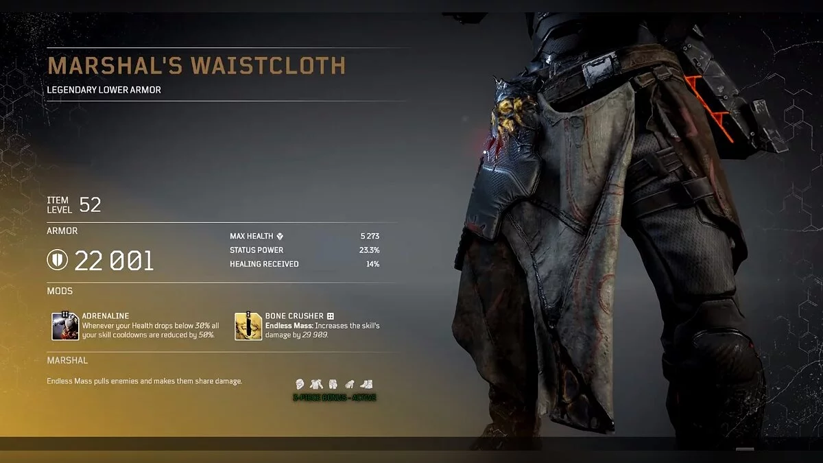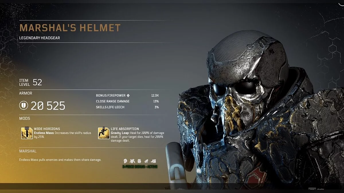 К указанной выше сборке лучше всего подойдёт комплект брони «Маршал» (Marshal's Armor Set), который заметно усиливает навык «Бесконечная масса» (Endless Mass).