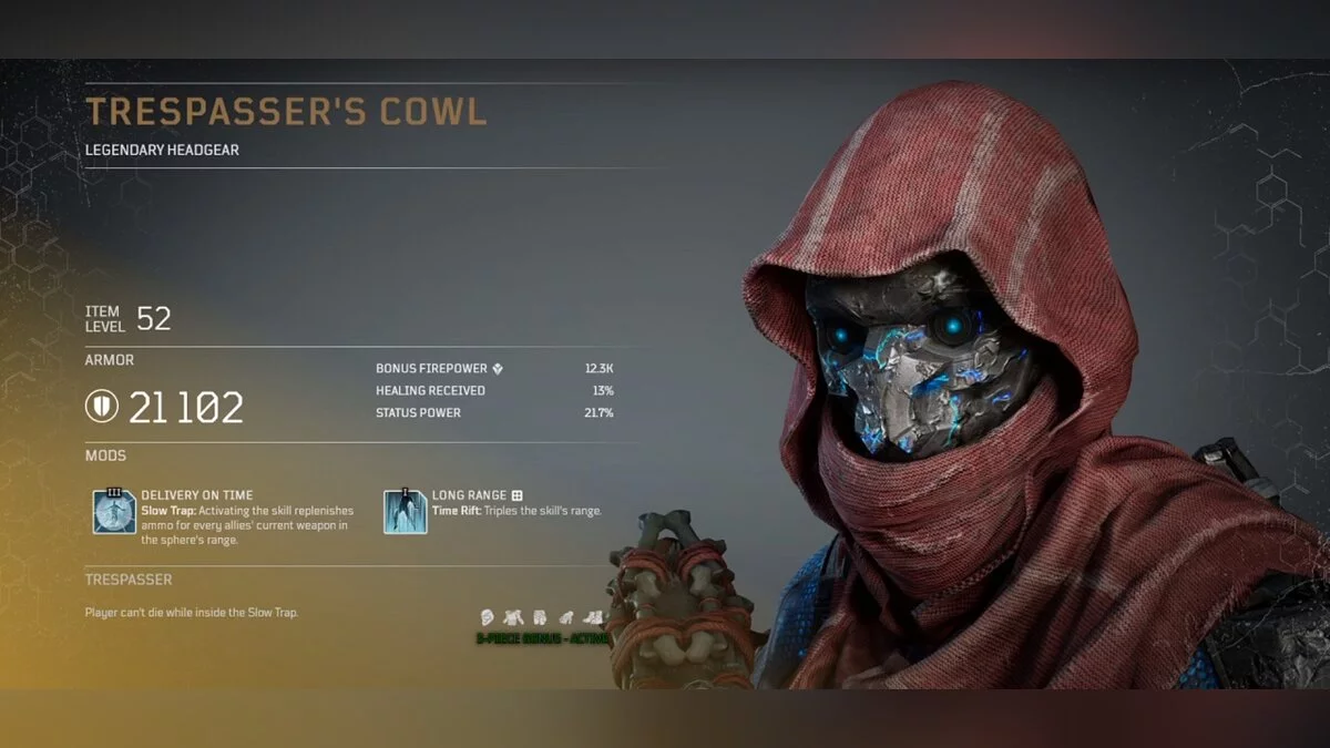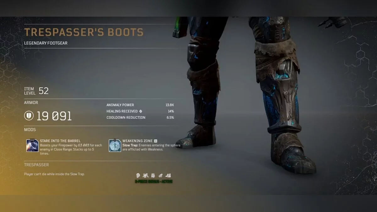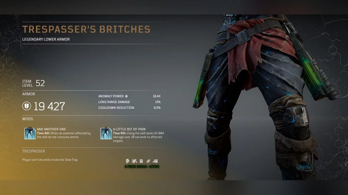 В качестве аналога можно воспользоваться комплектом брони «Нарушитель» (Trespasser Armor Set), который делает игрока неуязвимым внутри купола замедляющей ловушки.