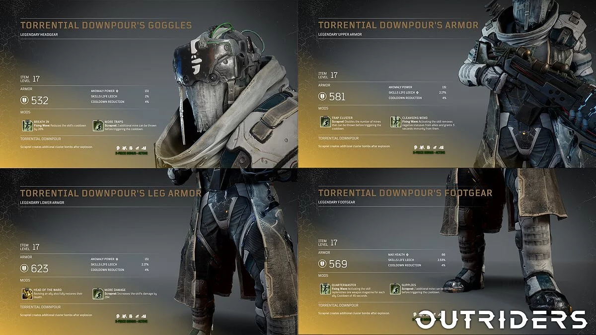 Ещё одним удачным вариантом является набор «Проливной дождь» (Torrential Downpour Armor Set), поскольку он улучшает способность «Поражающие элементы» (Scrapnole). Усиленный навык позволяет создавать дополнительные кассетные бомбы после их взрыва.