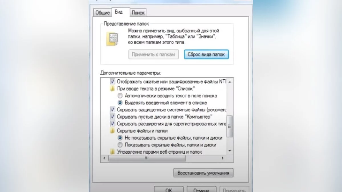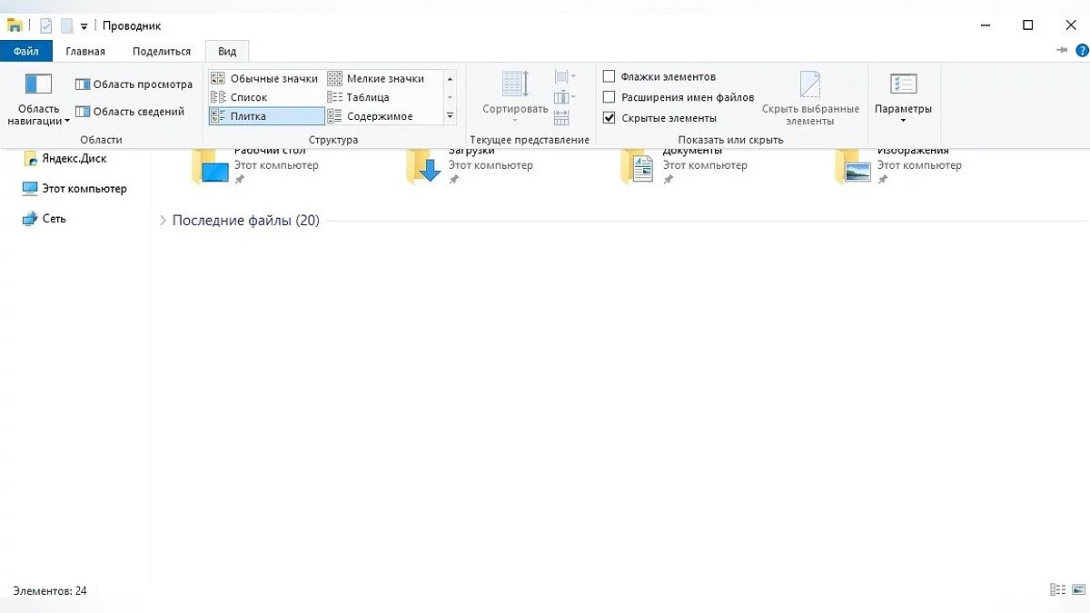 - Отметить галочкой поле «Скрытые элементы».