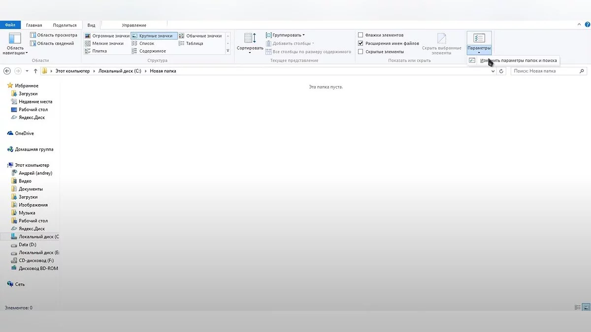 - В верхней правой части выберите «Параметры» и затем «Изменить параметры папок и поиска»;