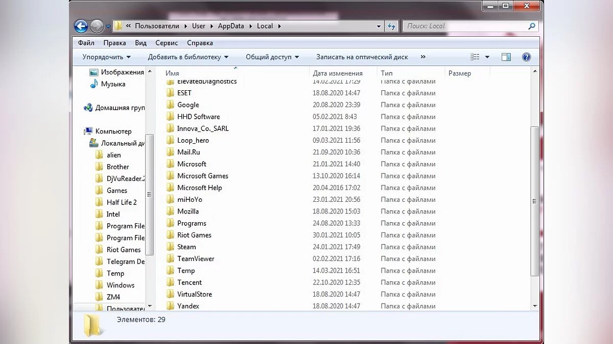 - Откройте папку «AppData», а затем «Local»;