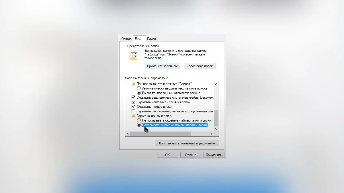 - В самом конце найдите «Скрытые файлы и папки» и выберите поле «Показывать скрытые файлы, папки и диски»;