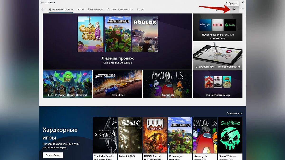 Переходим в магазин Microsoft Store и нажимаем в правом верхнем углу на фотографию профиля. Если у игрока несколько учетных записей, то потребуется войти во все, однако выбрать текущей ту учетную запись, на которой совершалась покупка игры. В магазине Microsoft Store загружаем любое бесплатное приложение. Снова пытаемся запустить игру на странице «Библиотека» магазина Microsoft Store.