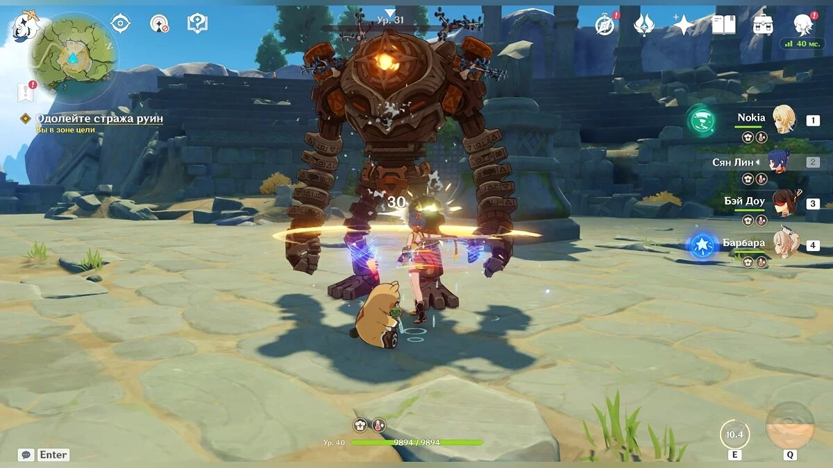 Вернитесь в Мондштад и найдите Сахарозу рядом с лавкой Тимея. Паймон напомнит вам, что нужно поговорить с Барбарой. В этот момент девушку можно найти в соборе Мондштадта. Барбара направит вас к храму Тысячи ветров, что на северо-востоке от города. Доберитесь до этой области и одолейте стража руин. Противник не будет представлять особой опасности на любом уровне Мира.