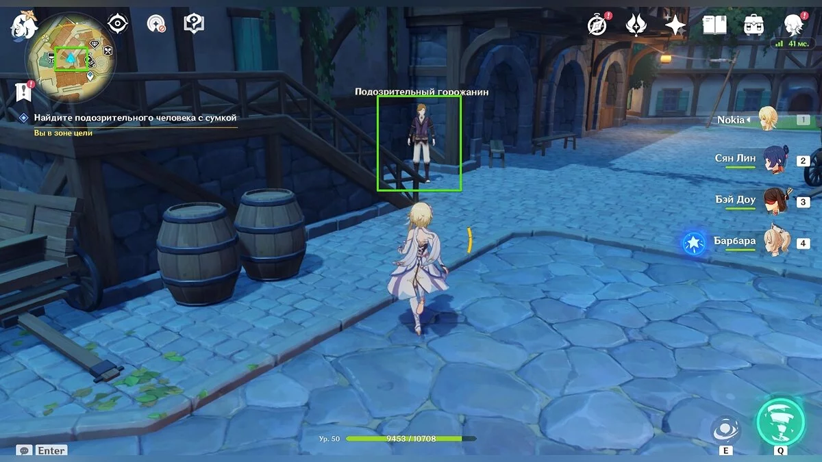 Чтобы начать этот квест, поговорите с девушкой по имени Вэл, которая стоит неподалёку от входа в собор Мондштадта. Она попросит найти подозрительного человека с сумкой. На самом деле никакой сумки нет и вам просто нужно найти определённого мужчину в районе центральной площади. Нужного человека мы указали на скриншоте ниже.