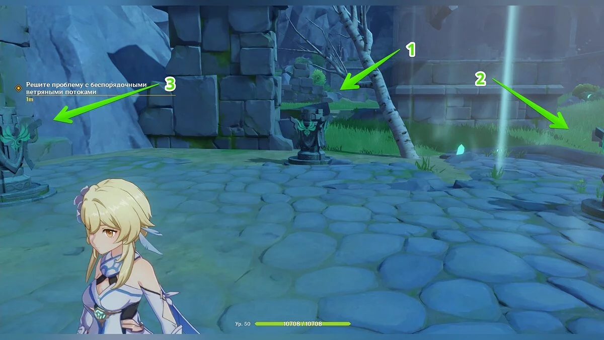 После подношения цветов статуе Анемо Архонта, отправляйтесь в логово Ужаса бури и решите проблему с беспорядочными ветряными потоками. Для этого вам сперва нужно разобраться с группой монстров, затем активировать Анемо колонны в нужной последовательности. Вы также можете воспользоваться подсказкой. Для этого активируйте устройство позади колонн.
