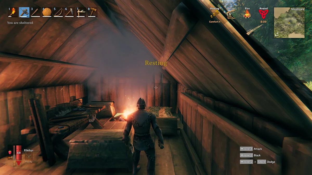 Костер в Valheim согревает персонажа холодными ночами и дает возможность приготовить сырое мясо после того, как вы добавите к нему вертел (стойка для готовки). Кровать также даёт вам точку возрождения, если вы погибните во время исследования мира — это очень важно, потому что в противном случае вы можете появиться далеко от того места, откуда начали. Это может привести к потере вашего снаряжения, если вы не сможете добраться до точки гибели. После сна герой получает бафф «отдохнувший» на короткое время.