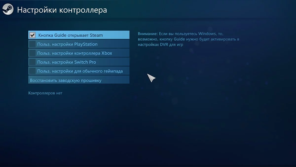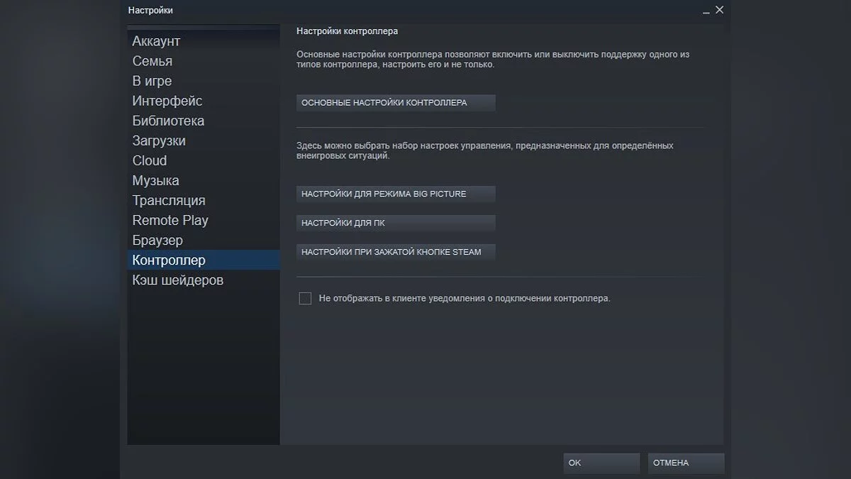 - Открываем настройки Steam и переходим в раздел «Контроллер».