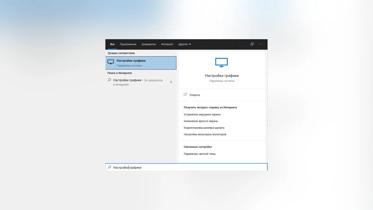 - В поиске на панеле задач находим «Настройки графики» и открываем их.