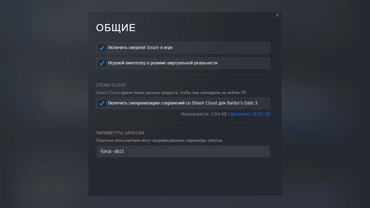 - В строке «Параметры запуска» вводим «-force -dx11» без кавычек.