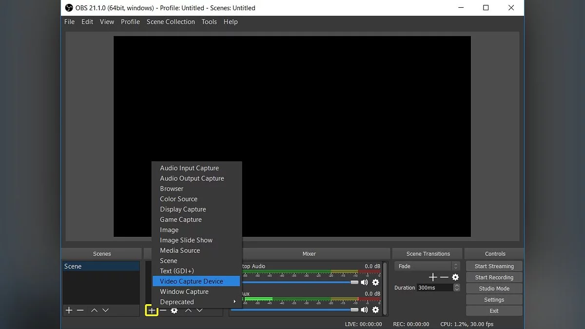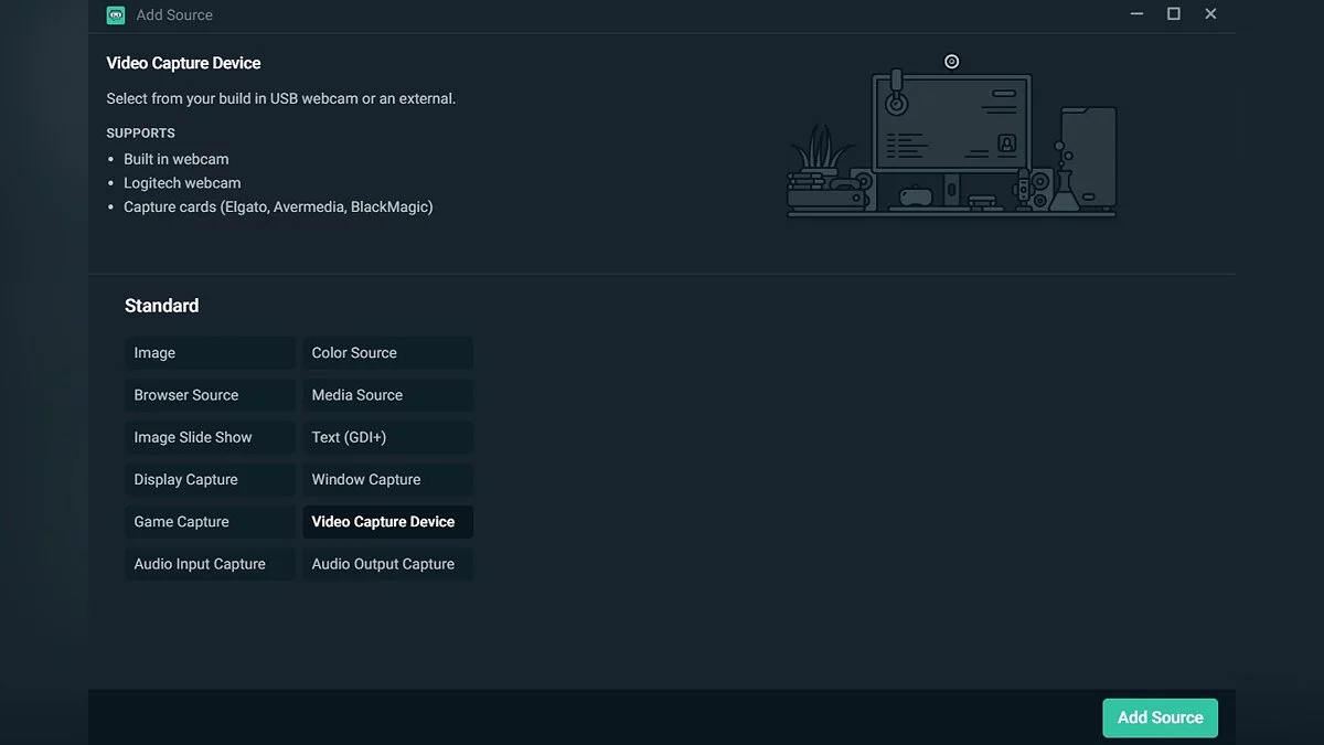 - Выбираем «Video Capture Device» и нажимаем кнопку «Add Source».