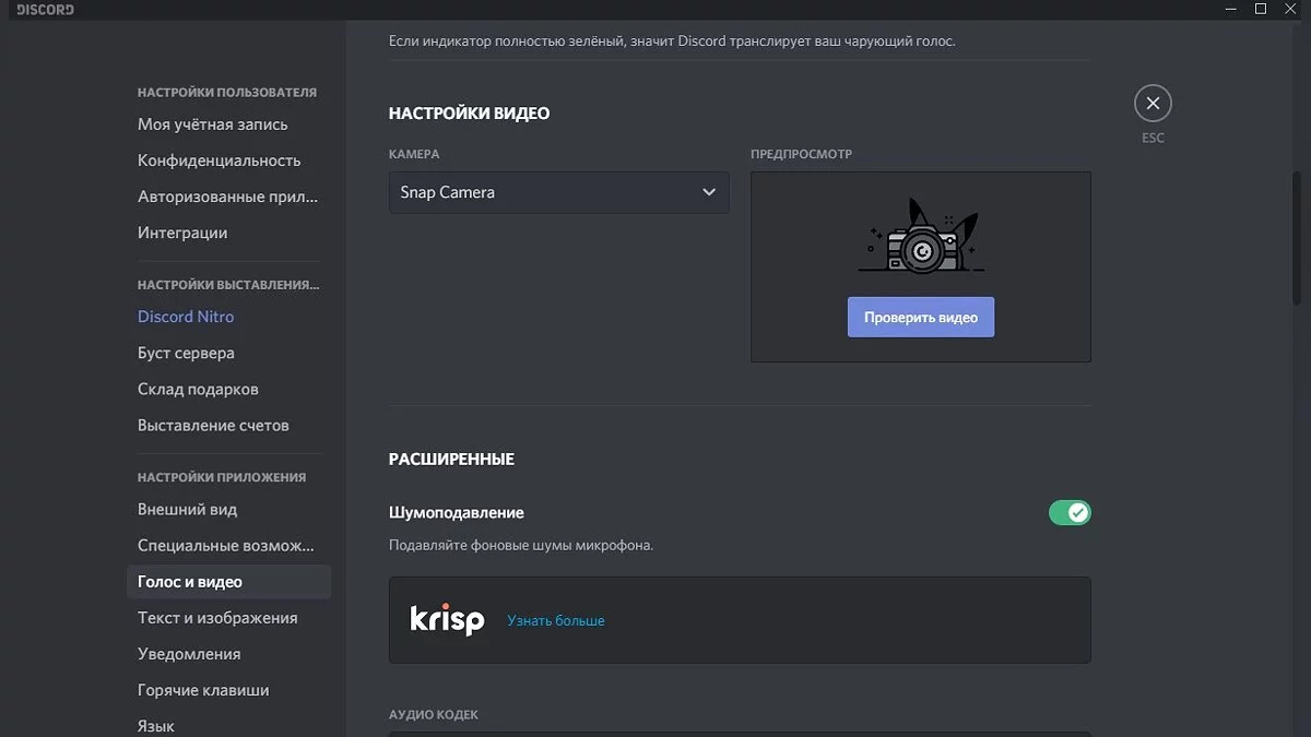 - Нажимаем «Голос и видео» и листаем страницу ниже до раздела «Настройки видео».