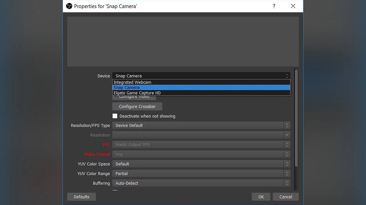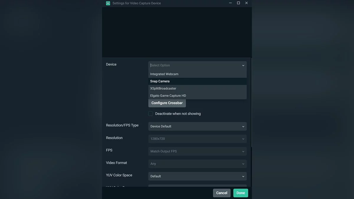 - В следующем окне в пункте «Device» выбираем Snap Camera и нажимаем кнопку «Done».