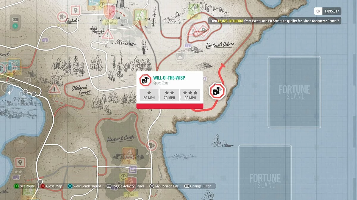 Переместившись на остров Фортуны, завершаем первую вступительную гонку и получаем доступ к нескольким сокровищам. Для получения каждого из них потребуется решить загадку, представленную в соответствующем меню. При выполнении всех условий игроку показывается на карте примерное местоположение сокровища с наградой. После нахождения сундука необходимо разбить его своей машиной. За выполнение этого действия игрок будет вознаграждён миллионом кредитов. Этого вполне достаточно, чтобы приобрести почти любой автомобиль и купить множество недвижимости в игре. Всего на просторах острова Фортуны спрятано 10 сундуков.