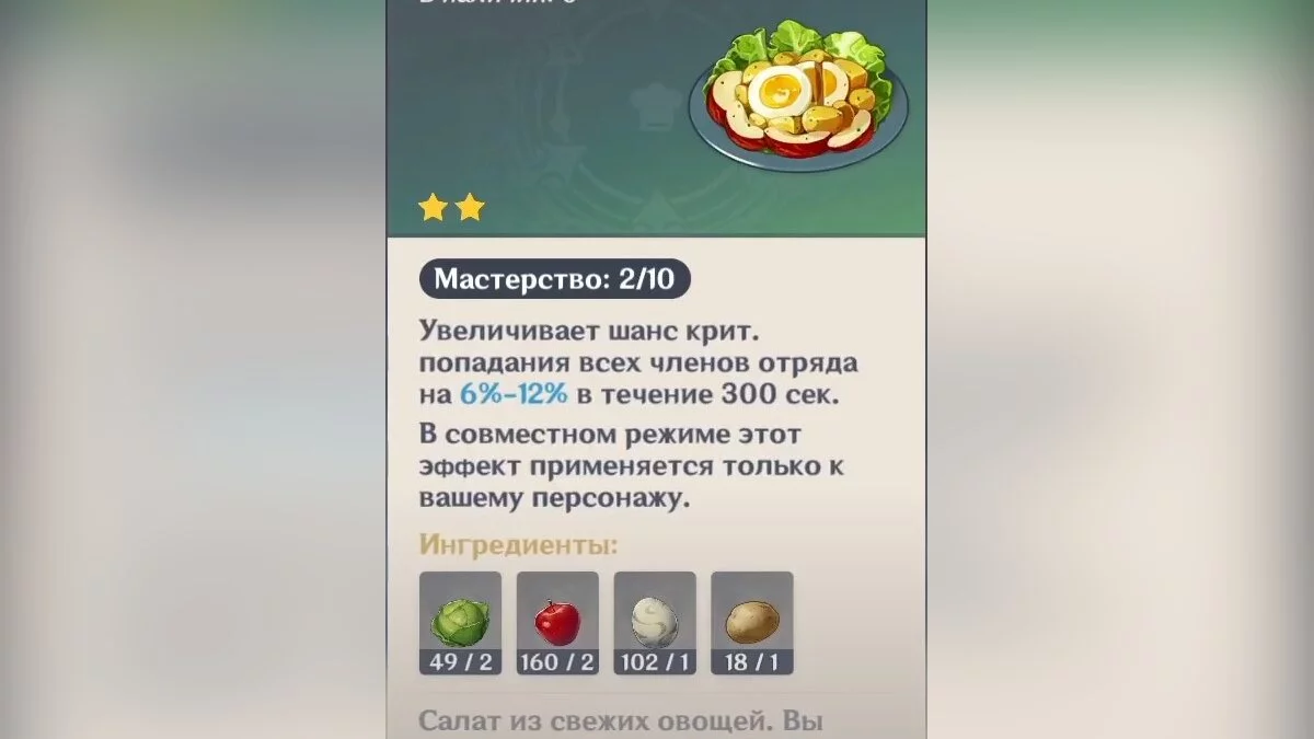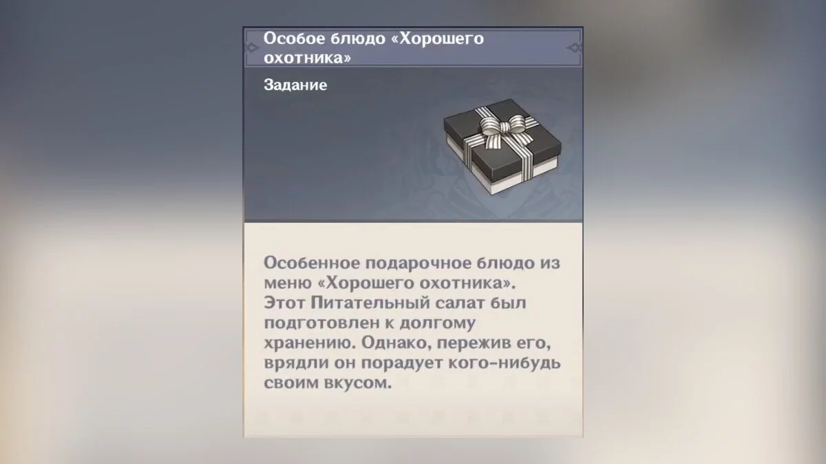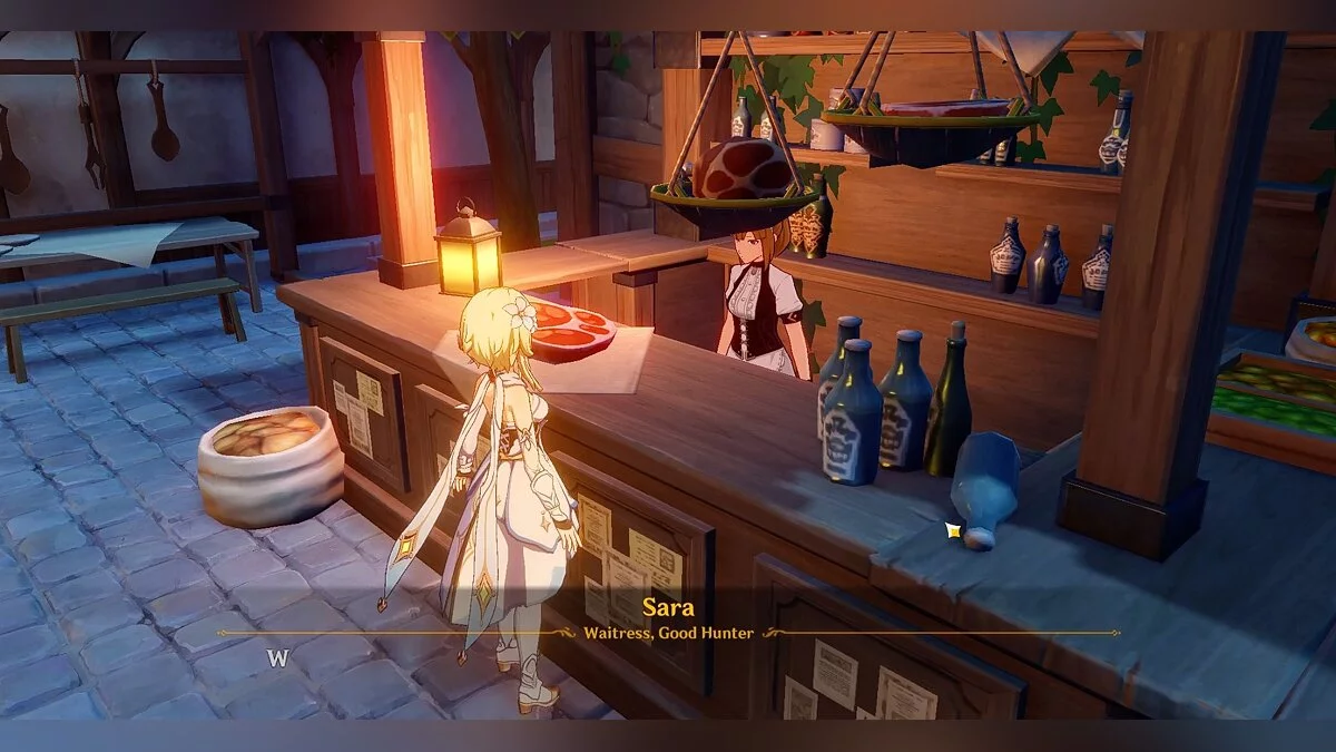 Виктор попросит героя принести мондштадтские диковинки. Отправляемся в таверну «Хороший охотник» и разговариваем с Сарой. Девушка расскажет путешественнику о несвежести имеющихся деликатесов, поэтому посоветует приготовить новое блюдо. Выбираем любые варианты ответов и Сара порекомендует сделать питательный салат, который она подготовит к длительному путешествию. Для его приготовления необходимы некоторые предметы: