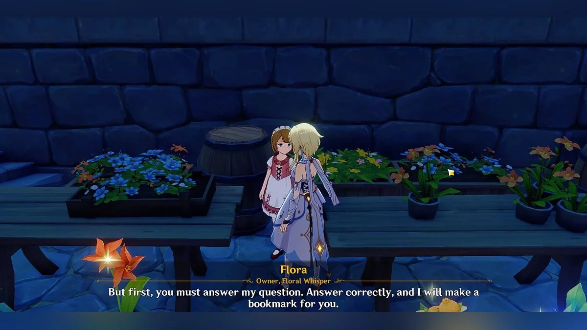 Спрашиваем её о диковинках и отвечаем «Да» на вопрос об одуванчиках. За правильный ответ девушка передаст путешественнику закладку из сухой ветряной астры. В ином случае придётся заняться сбором одуванчиков самостоятельно. Для этого придётся выйти за пределы Мондштадта и отыскать подходящие цветы у ворот столицы.