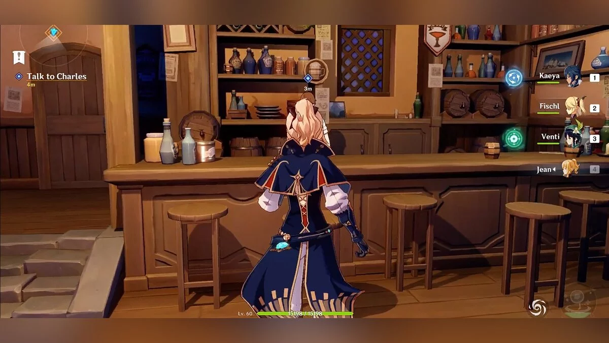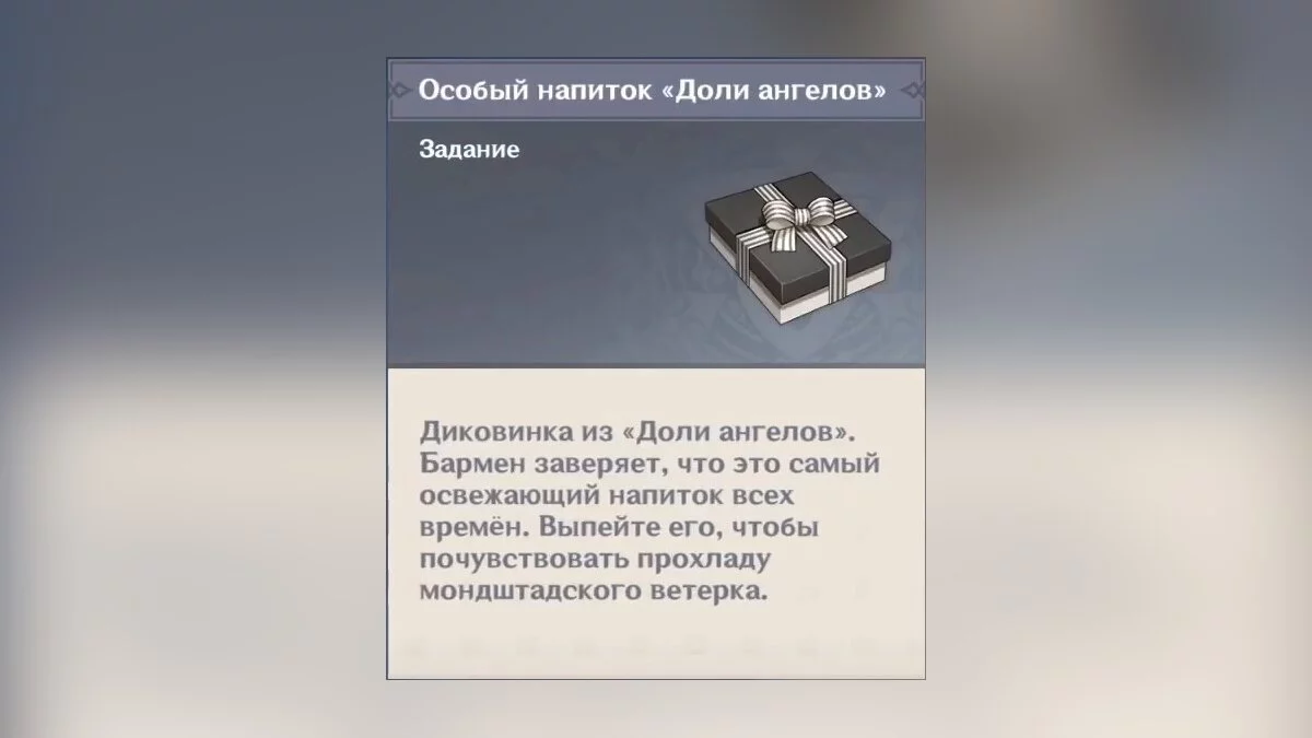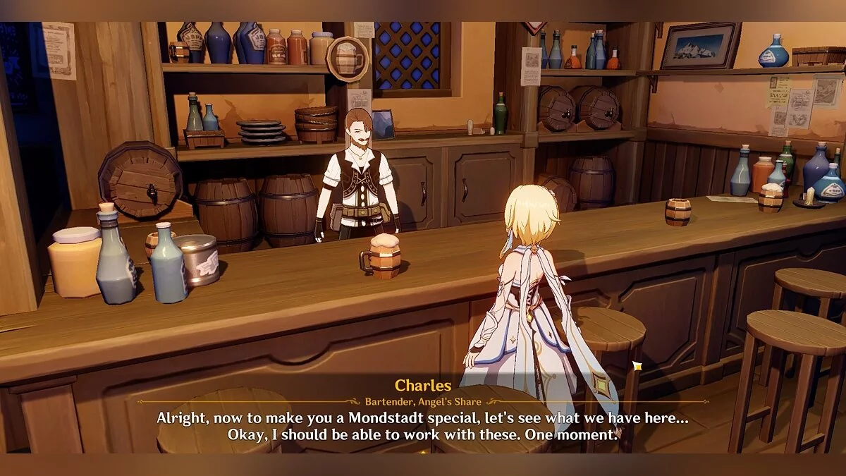 Следуем по маркеру в таверну «Доли ангелов» для разговора с Чарльзом. Сообщаем ему, что хотим купить выпивку для друга. Он откажется продавать алкогольный напиток герою, поэтому предложит сделать особый мондштадтский напиток, подходящий по всем требованиям. Нужные ингредиенты ещё не доставили бармену, поэтому он попросит проверить, что случилось с транспортным караваном.