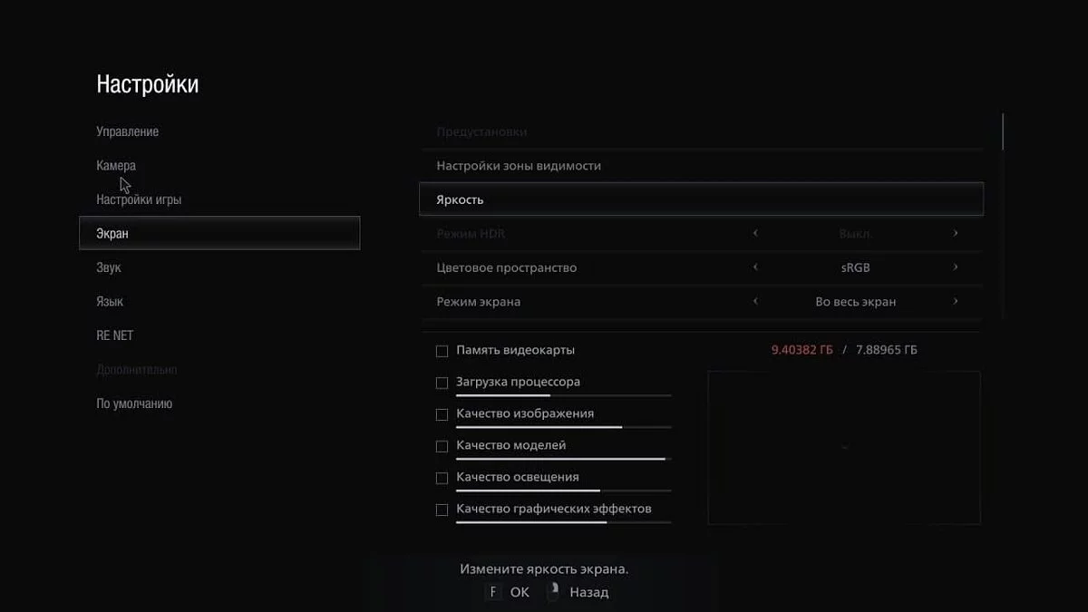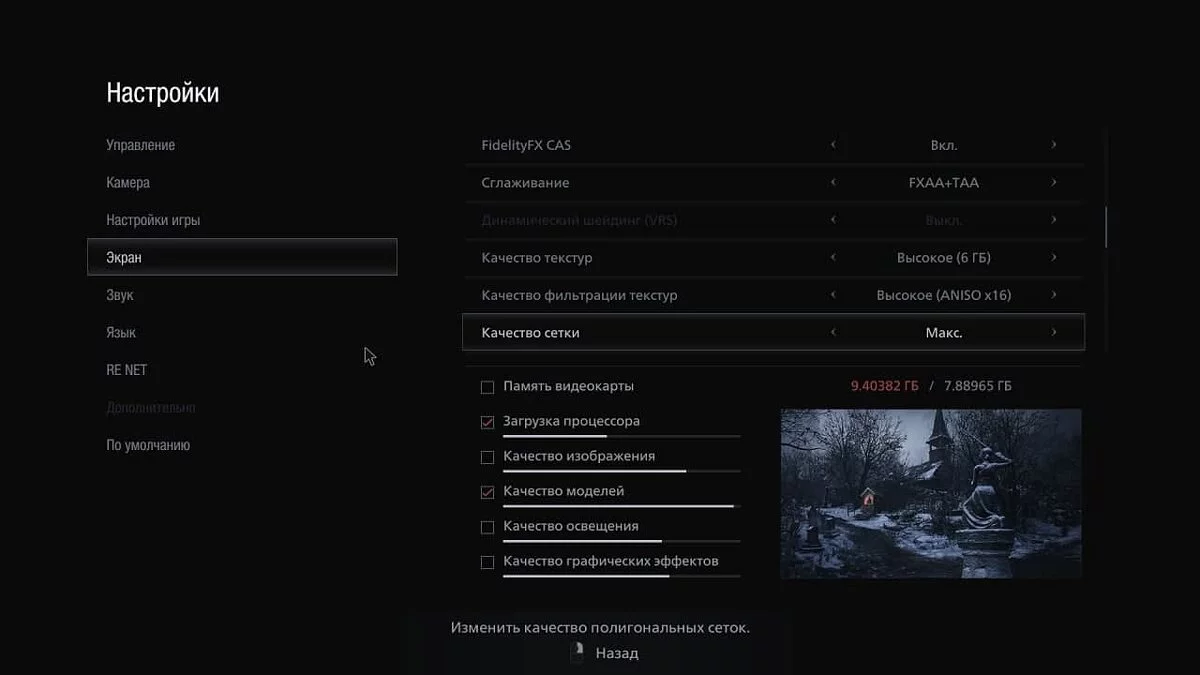 - Макс. — устанавливает все параметры на максимум. Требует 12,212 ГБ, что больше, чем у большинства видеокарт на рынке.