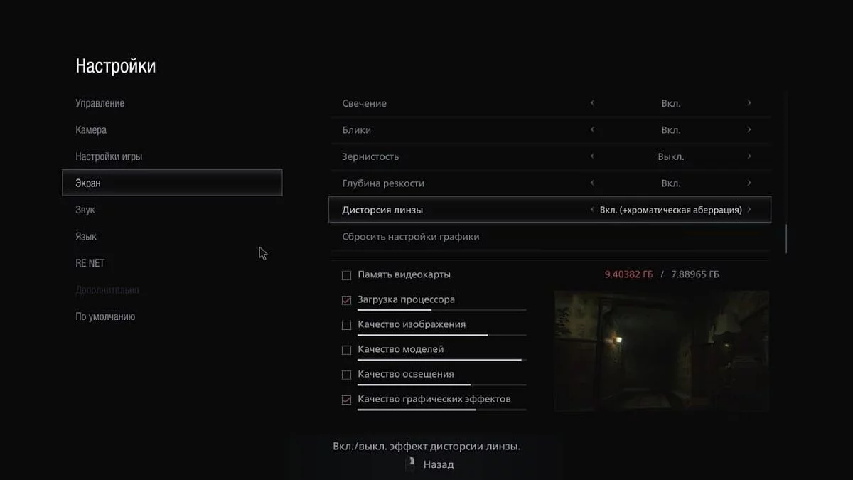 - Дисторсия линзы: вкл. Не влияет на производительность.
