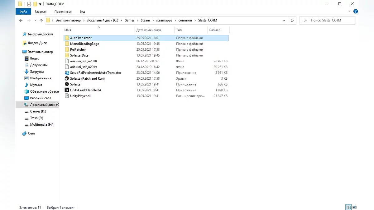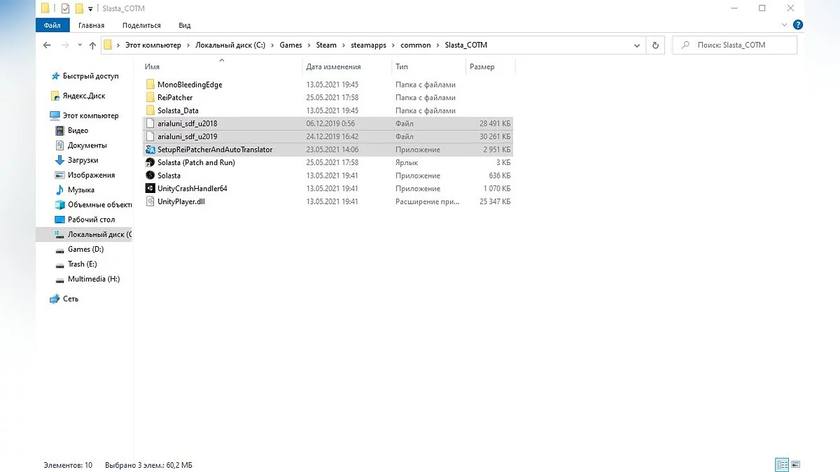 - Распаковываем оба архива в корневую папку игры по пути «…/Steam/steamapps/common/Slasta_COTM». В папку добавятся три файла «SetupReiPatcherAndAutoTranslator.exe», «arialuni_sdf_u2018» и «arialuni_sdf_u2019».