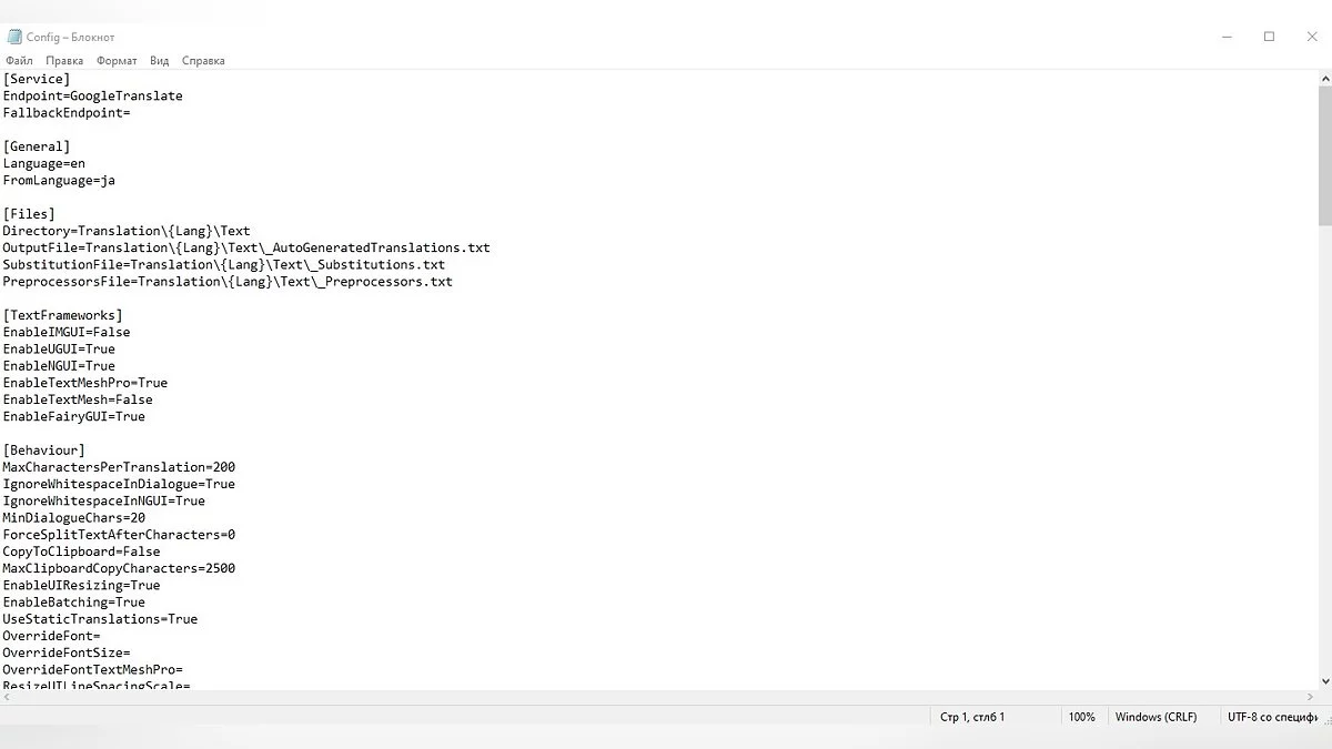- В разделе «[Behaviour]» меняем строки «MaxCharactersPerTranslation=200», «IgnoreWhitespaceInDialogue=True», «IgnoreWhitespaceInNGUI=True» на «MaxCharactersPerTranslation=400», «IgnoreWhitespaceInDialogue=False» и «IgnoreWhitespaceInNGUI=False» соответственно.
