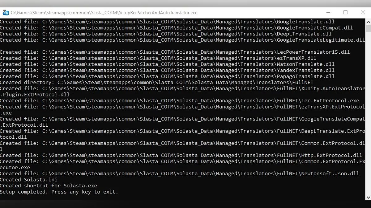 - Запускаем исполняемый файл «SetupReiPatcherAndAutoTranslator.exe». Приложение создаст необходимые для работы папки и новый ярлык «Solasta (Patch and Run)» в корневой папке. По окончании работы приложения необходимо нажать любую клавишу на клавиатуре.
