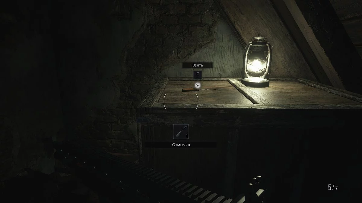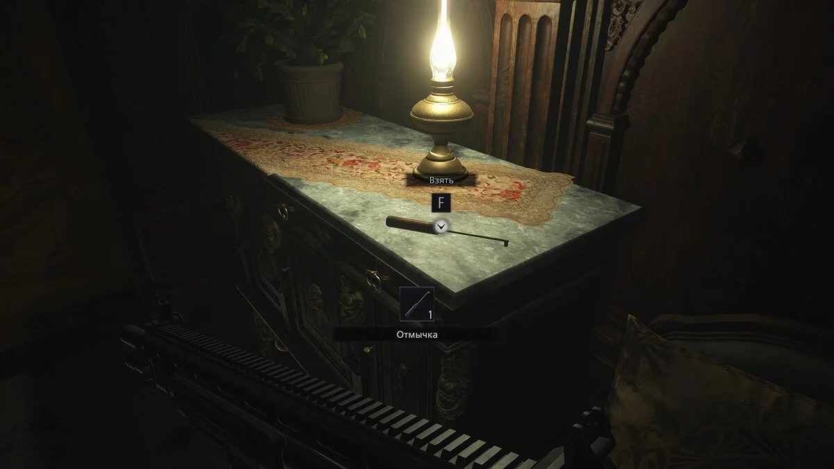 После побега от Димитреску на лифте, вы должны отправиться в оружейную, где произойдёт бой с одной из дочерей. Отмычку вы найдёте на тумбочке, где лежат самодельные бомбы. Использовать предмет можно рядом со спальней, где Итану посчастливилось повисеть на крюках: