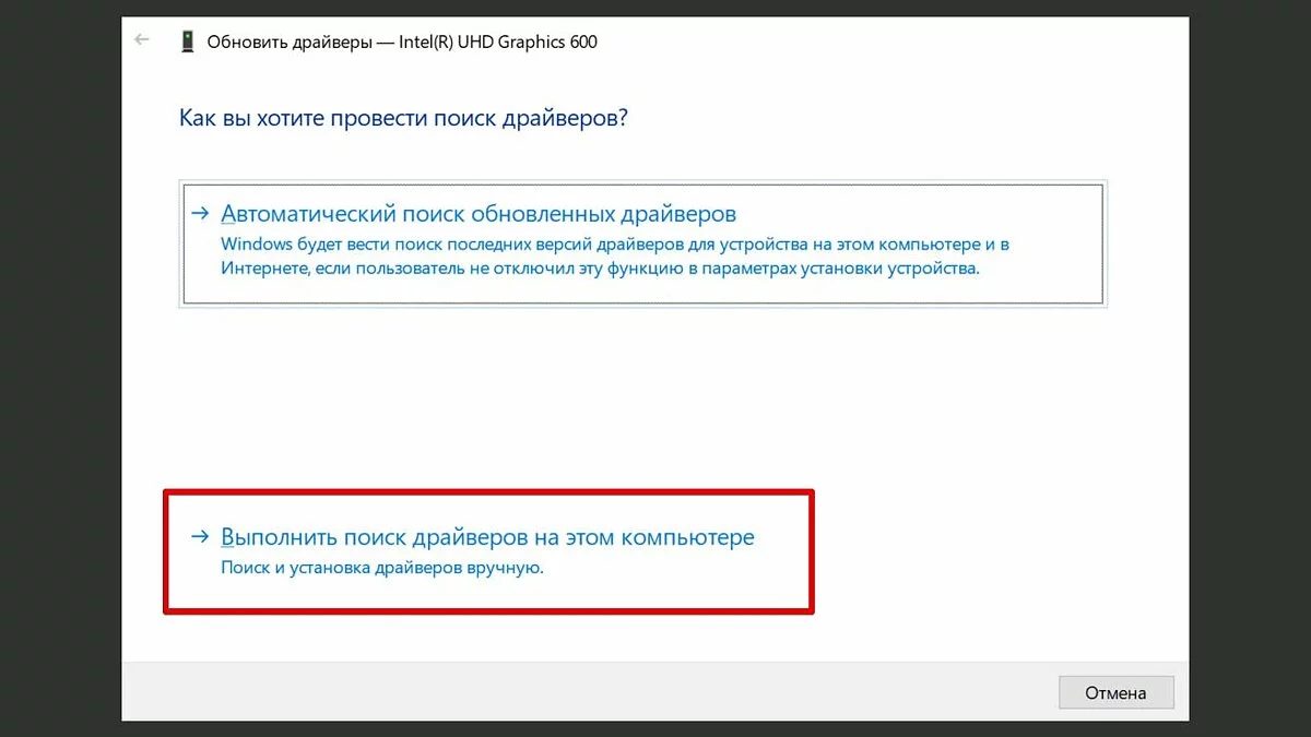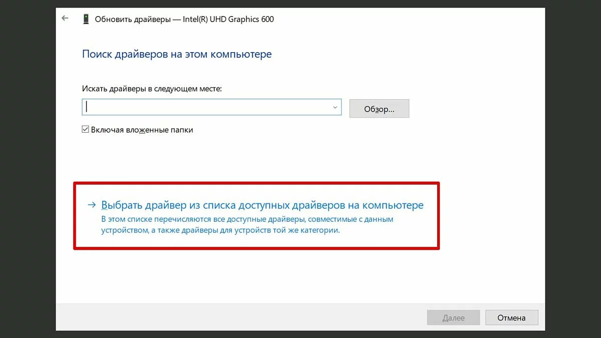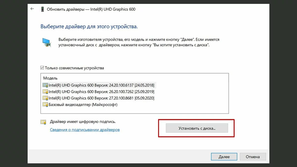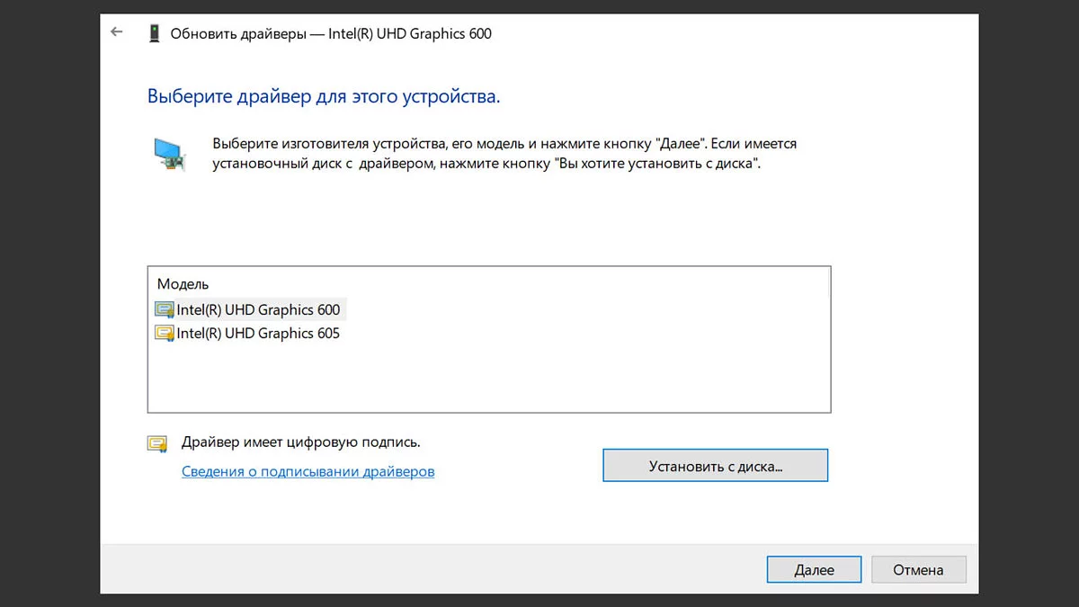 - Найдите папку с драйвером и выберите файл IntcDAud.inf, затем выберите Intel UHD Graphics 600 (у вас может быть другое наименование) и установите драйвер. Windows предупредит о возможной несовместимости драйвера, поэтому если не уверены, то не устанавливайте.