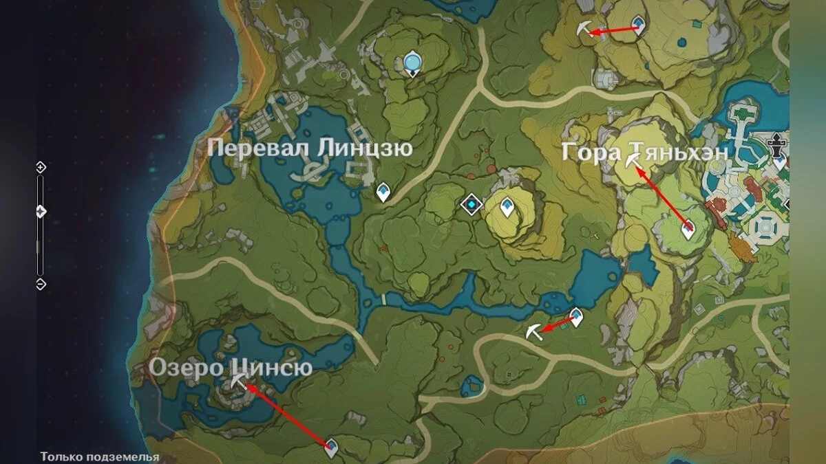 Теперь переходим к местам появления ресурса. Чаще всего нефрит можно найти у подножия гор или в пещерах Ли Юэ. Обратите внимание на места, отмеченные на картинках — вход в подземелья расположен неподалеку.