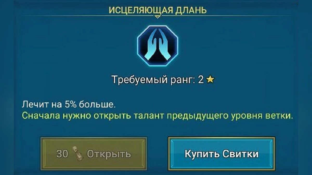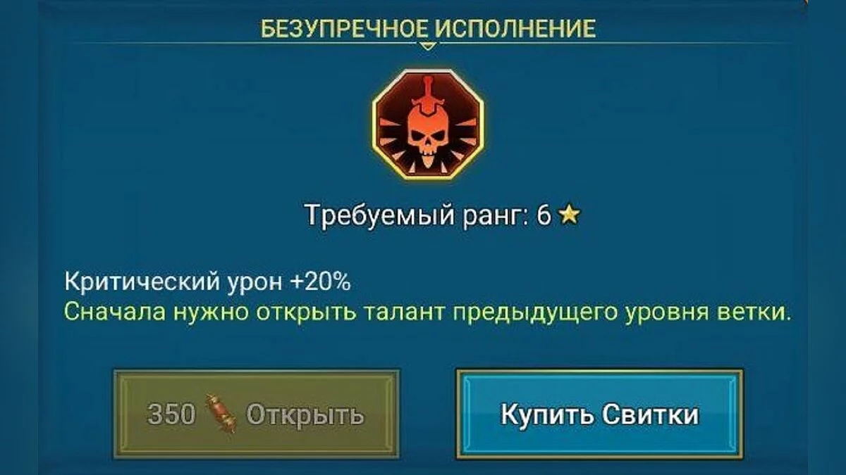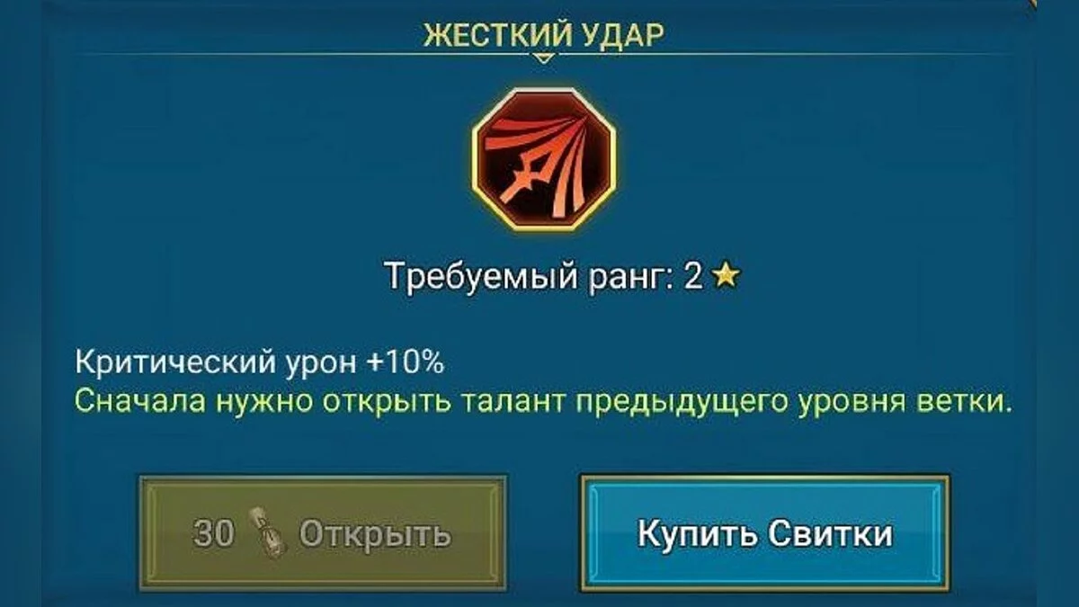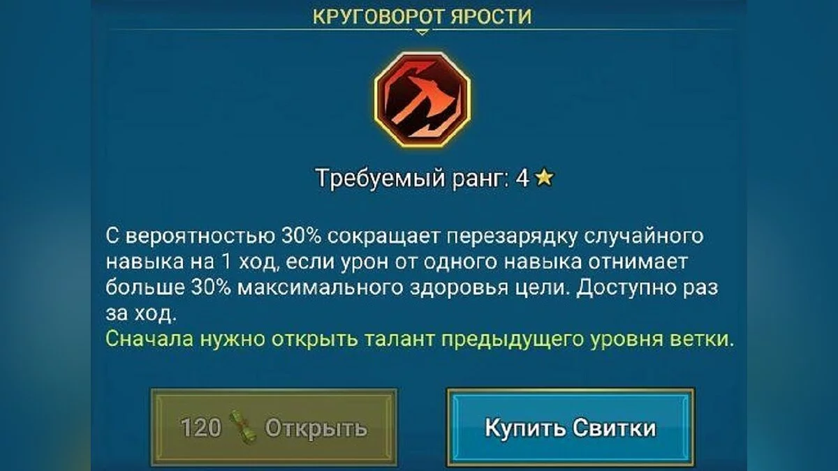 Для открытия таланта второго ряда вам потребуется сделать выбор из пяти вариантов, а также потратить 30 обычных (белых) свитков.