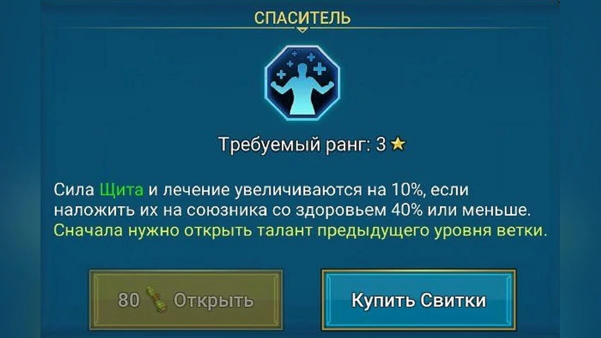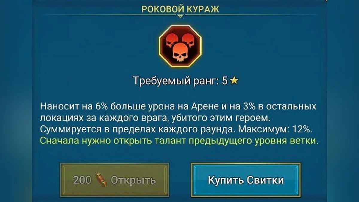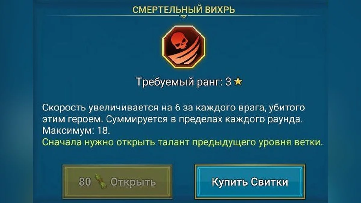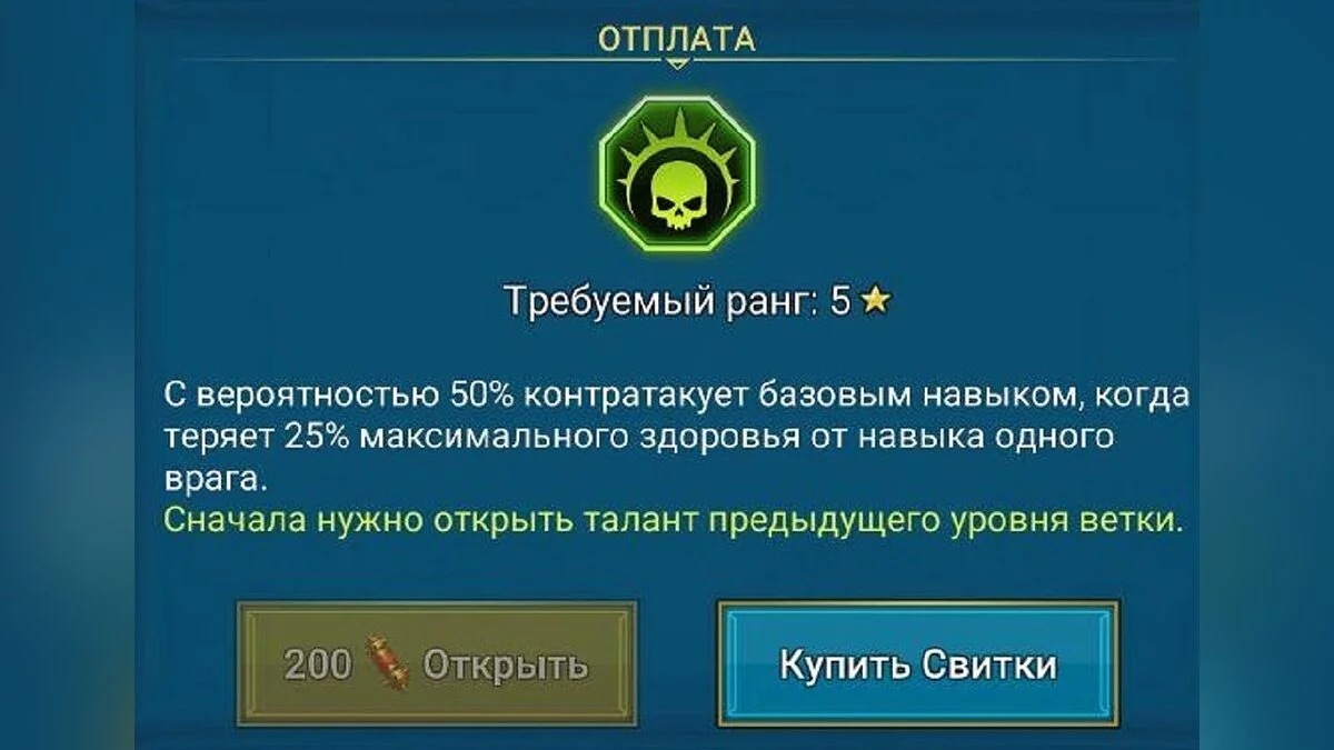 Для открытия таланта второго ряда вам потребуется сделать выбор из пяти вариантов, а также потратить 30 обычных (белых) свитков.