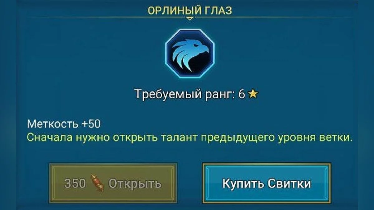 Орлиный глаз — параметр меткости героя возрастает на 50 единиц.