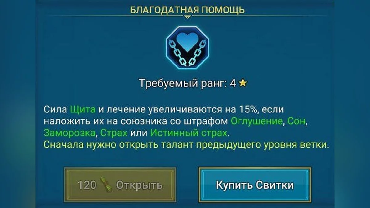 Благодатная помощь — эффективность накладываемого эффекта щита возрастает на 15%, если умение используется на союзнике, на котором висит эффект «Сна», «Оглушения», «Страха», «Заморозки» или «Истинного страха».