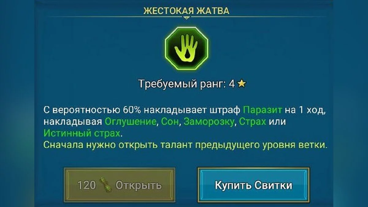 Жестокая жатва — если ваш герой накладывает на врага эффект «Оглушение», «Страх», «Истинный страх», «Заморозка» или «Сон», существует шанс в 60%, что на противника также будет наложен эффект «Паразит» (длится один ход).