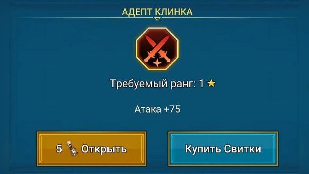 Адепт клинка — на 75 единиц повышает атаку выбранного чемпиона.