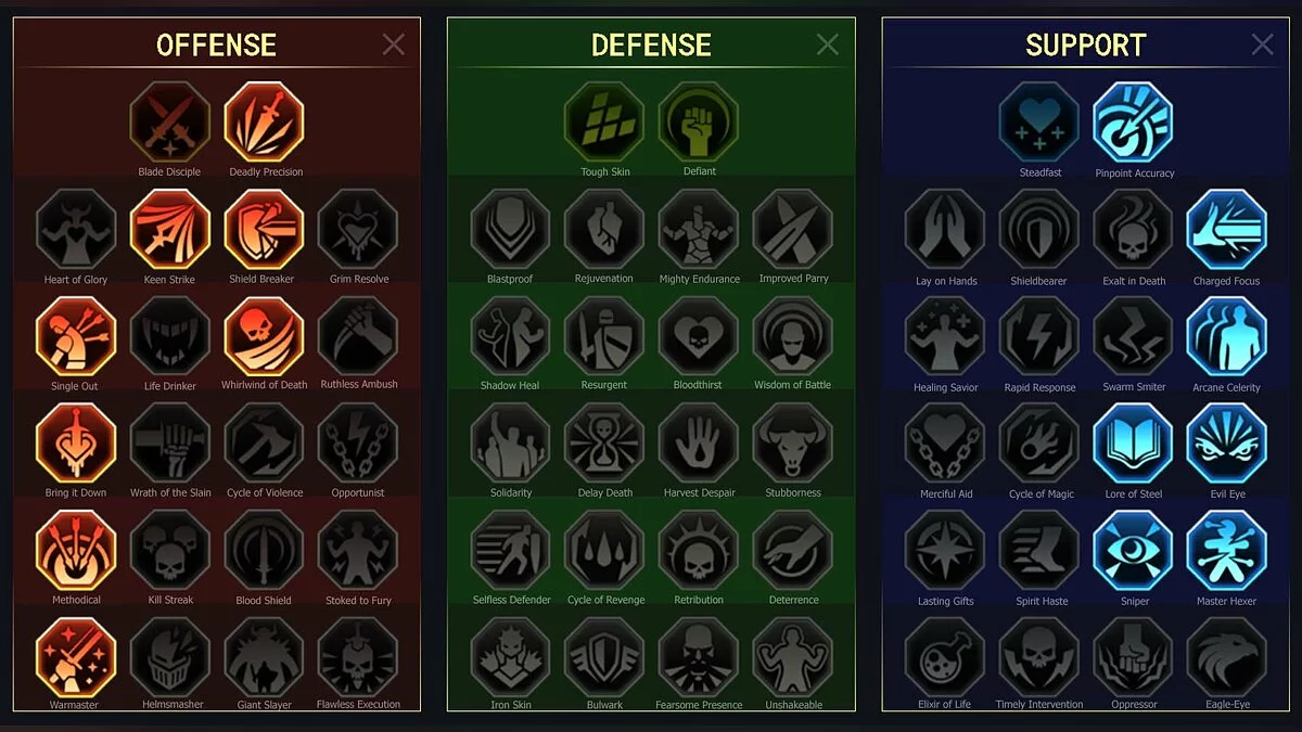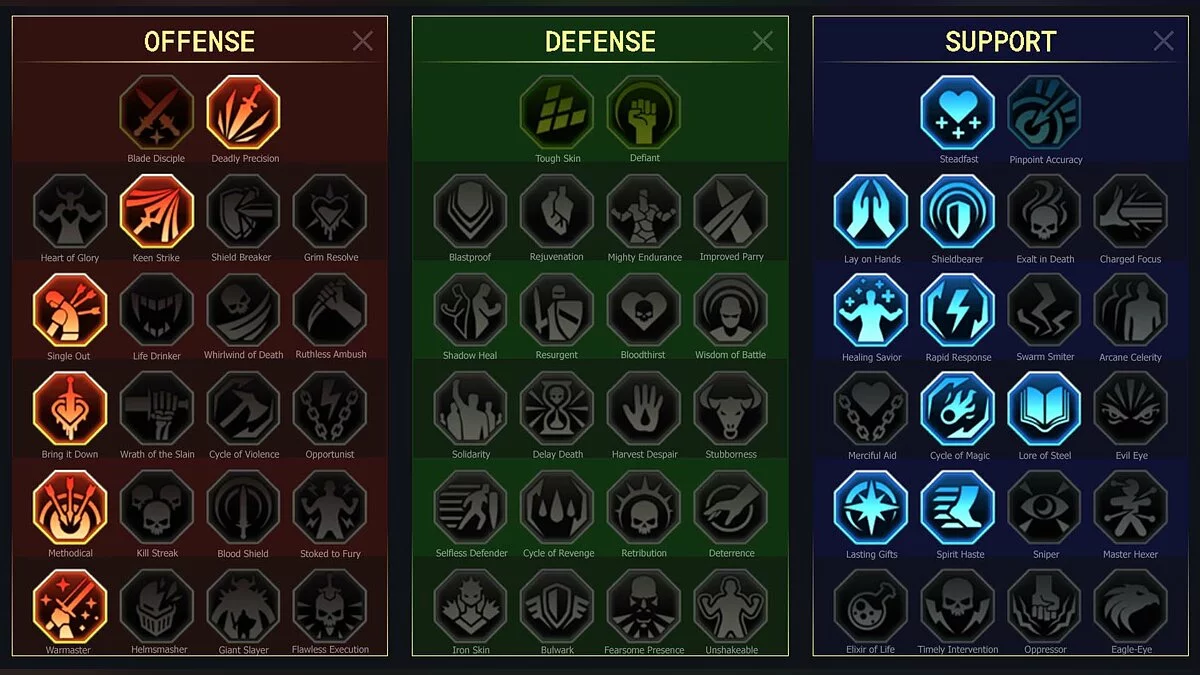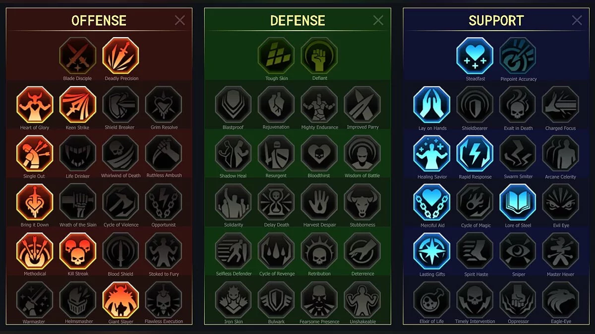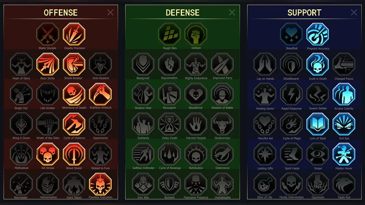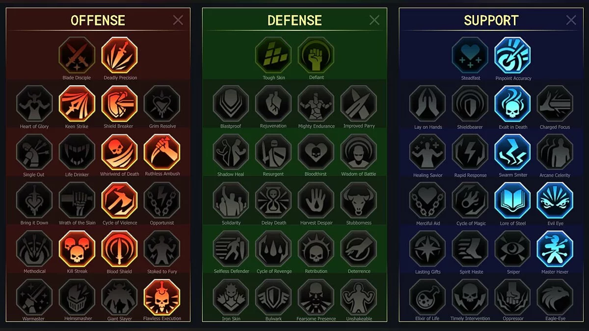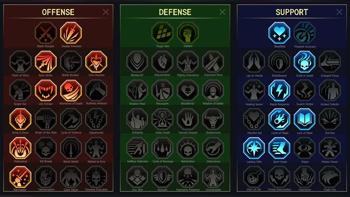 Таланты в игре делятся на три основные категории: атака, защита, поддержка. Каждый герой может выбрать две ветки для прокачки, оставив менее интересные умения нетронутыми. Для получения доступа к талантам вам потребуются специальные свитки, которые можно добыть в Лабиринте Минотавра. В этой локации вы можете отыскать свитки разной степени редкости (белые, зеленые и красные) и, чем глубже в Лабиринте вы пройдете, тем ценнее лут добудете.