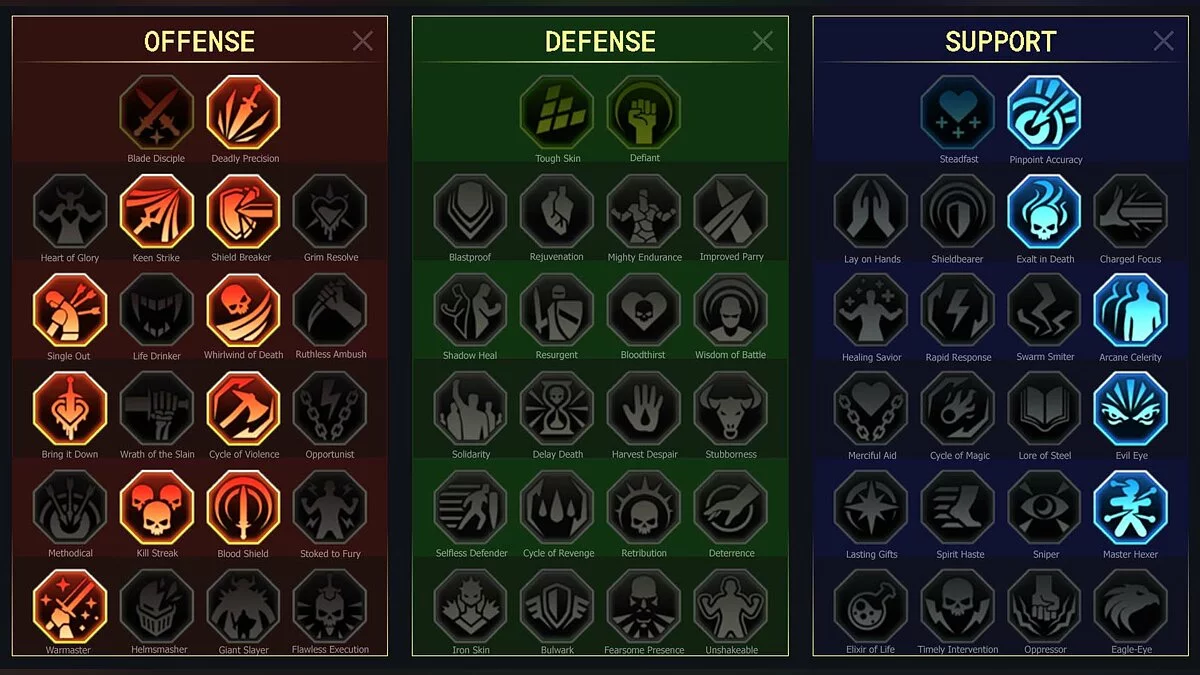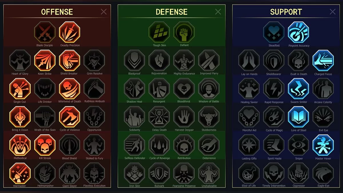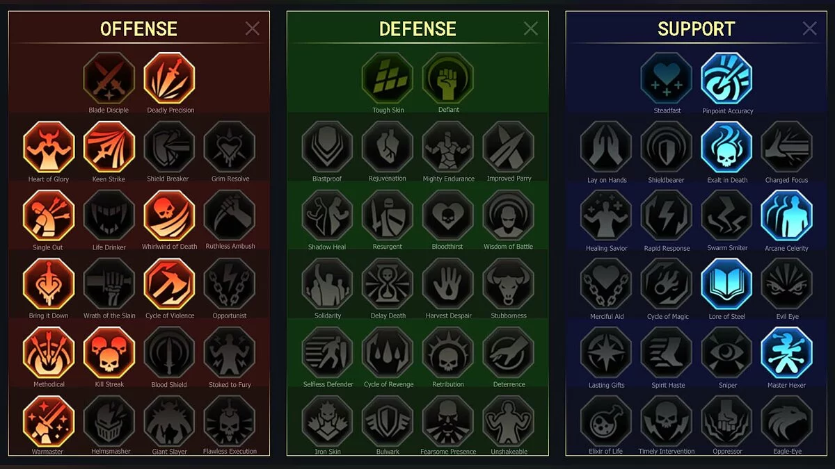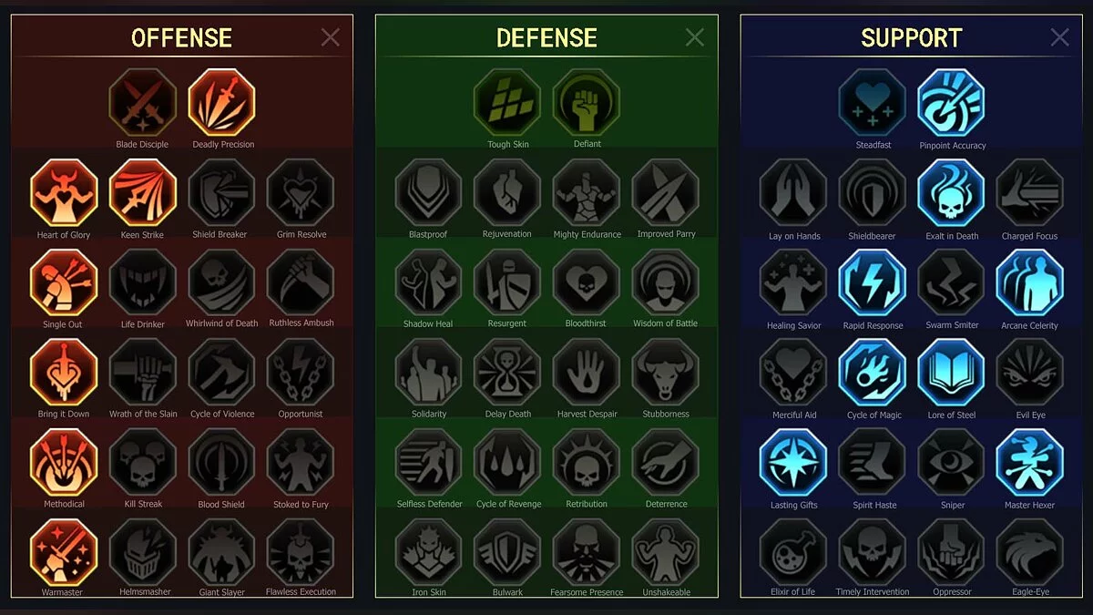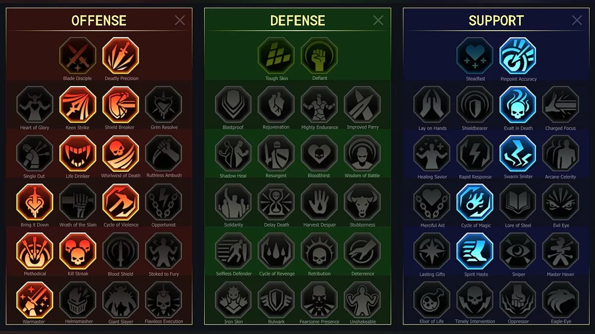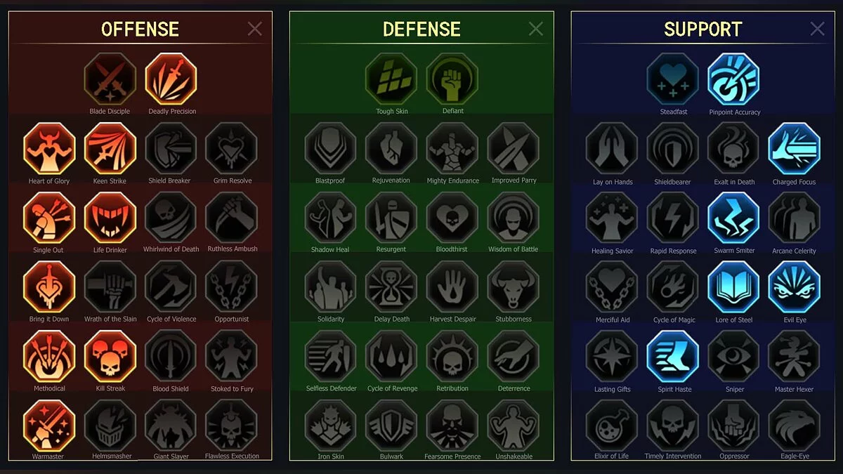 Таланты в игре делятся на три основные категории: атака, защита, поддержка. Каждый герой может выбрать две ветки для прокачки, оставив менее интересные умения нетронутыми. Для получения доступа к талантам вам потребуются специальные свитки, которые можно добыть в Лабиринте Минотавра. В этой локации вы можете отыскать свитки разной степени редкости (белые, зеленые и красные) и, чем глубже в Лабиринте вы пройдете, тем ценнее лут добудете.