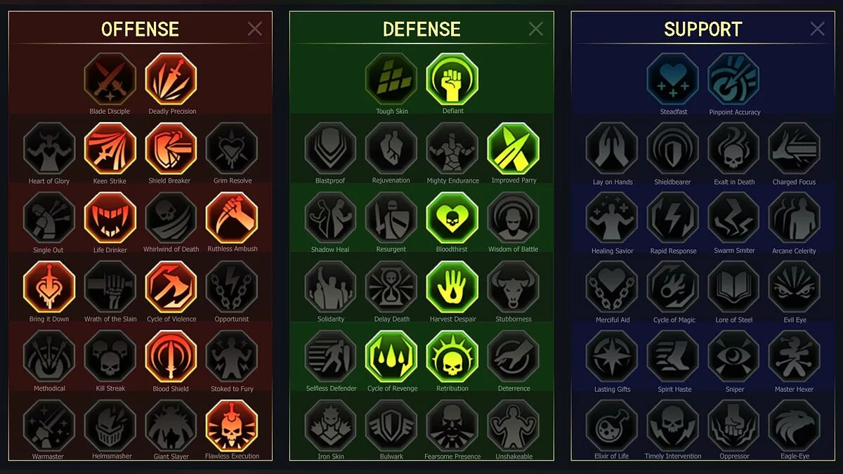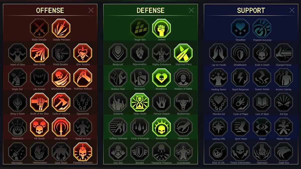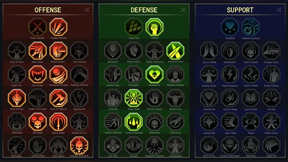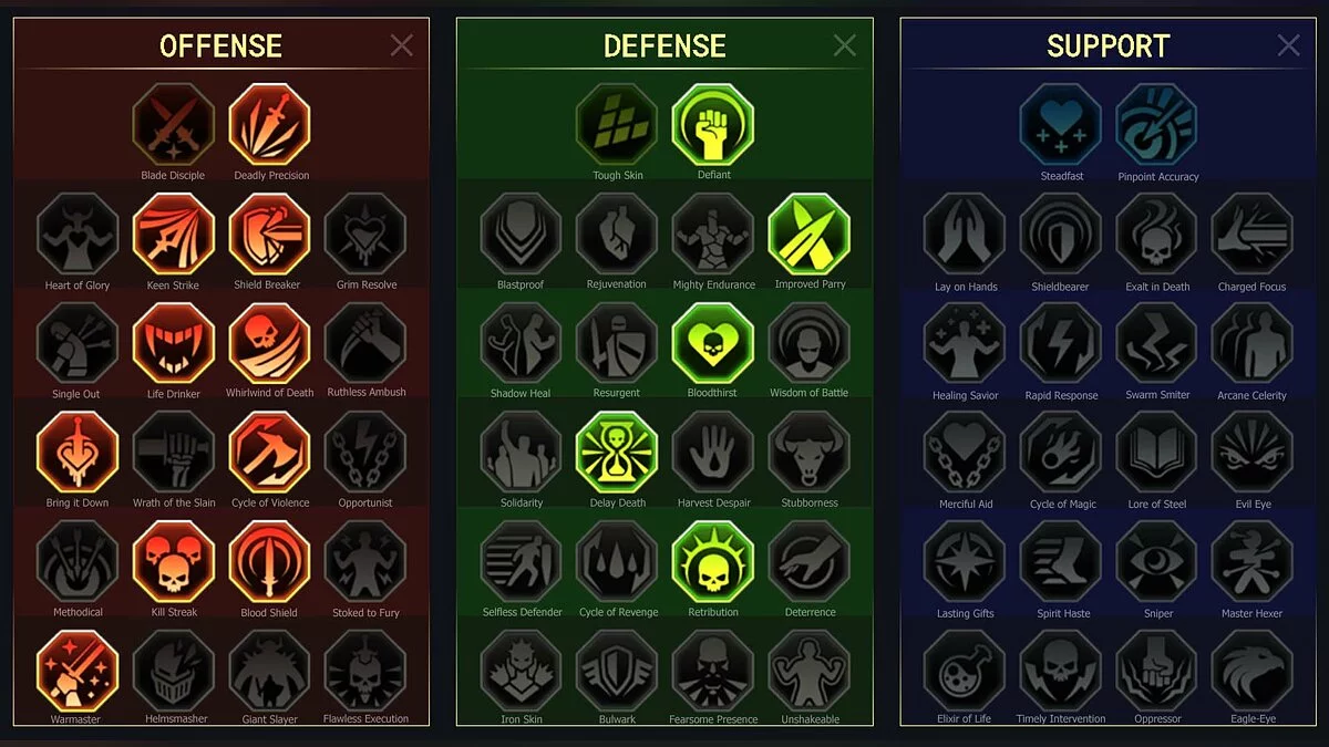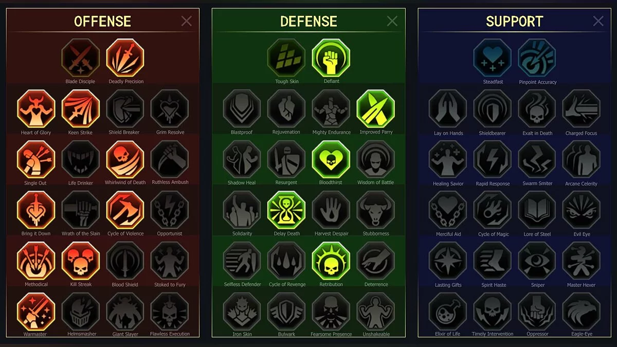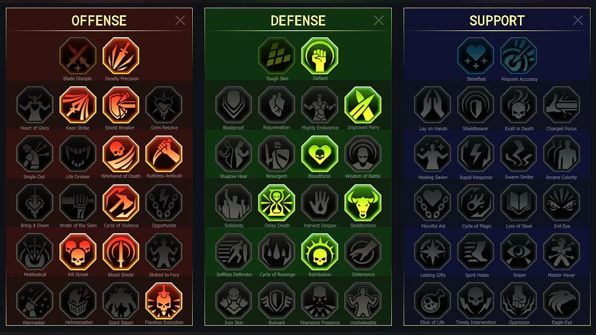Таланты в игре делятся на три основные категории: атака, защита, поддержка. Каждый герой может выбрать две ветки для прокачки, оставив менее интересные умения нетронутыми. Для получения доступа к талантам вам потребуются специальные свитки, которые можно добыть в Лабиринте Минотавра. В этой локации вы можете отыскать свитки разной степени редкости (белые, зеленые и красные) и, чем глубже в Лабиринте вы пройдете, тем ценнее лут добудете.