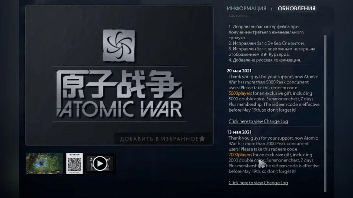 Для легкого старта и получения дополнительных бонусов в Atomic War предусмотрена возможность ввести промокоды. Например, за достижение пикового онлайна в 2000 человек разработчики позволили фанатам получить бесплатно удвоенное количество монет за победу.