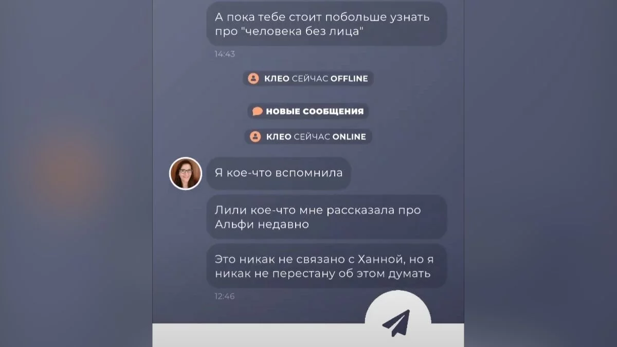 Когда вы откроете новые сюжетные диалоги, вернитесь в чат и поприветствуйте сестру пропавшей Ханны. Позже Клео напишет вам сообщение в личном чате.